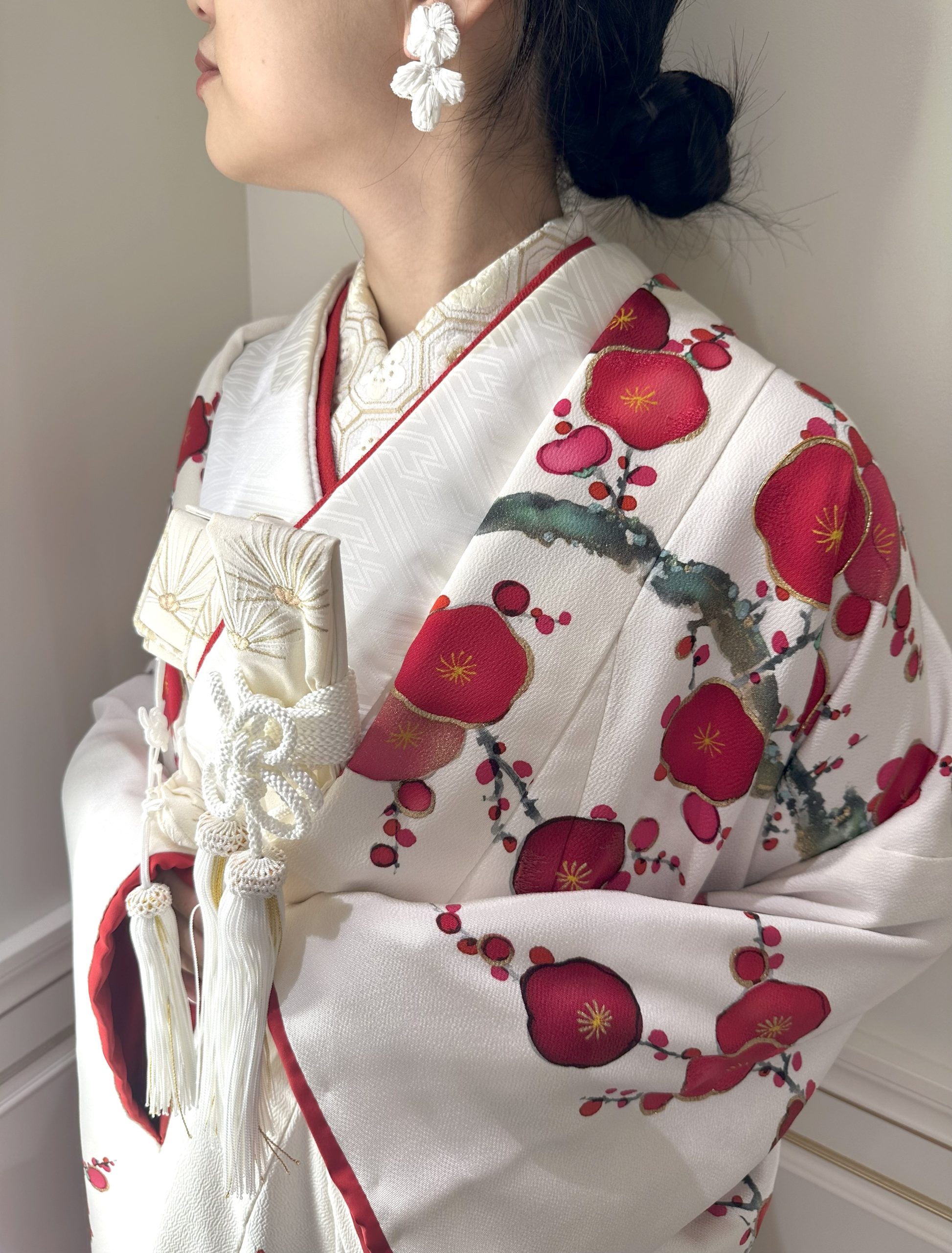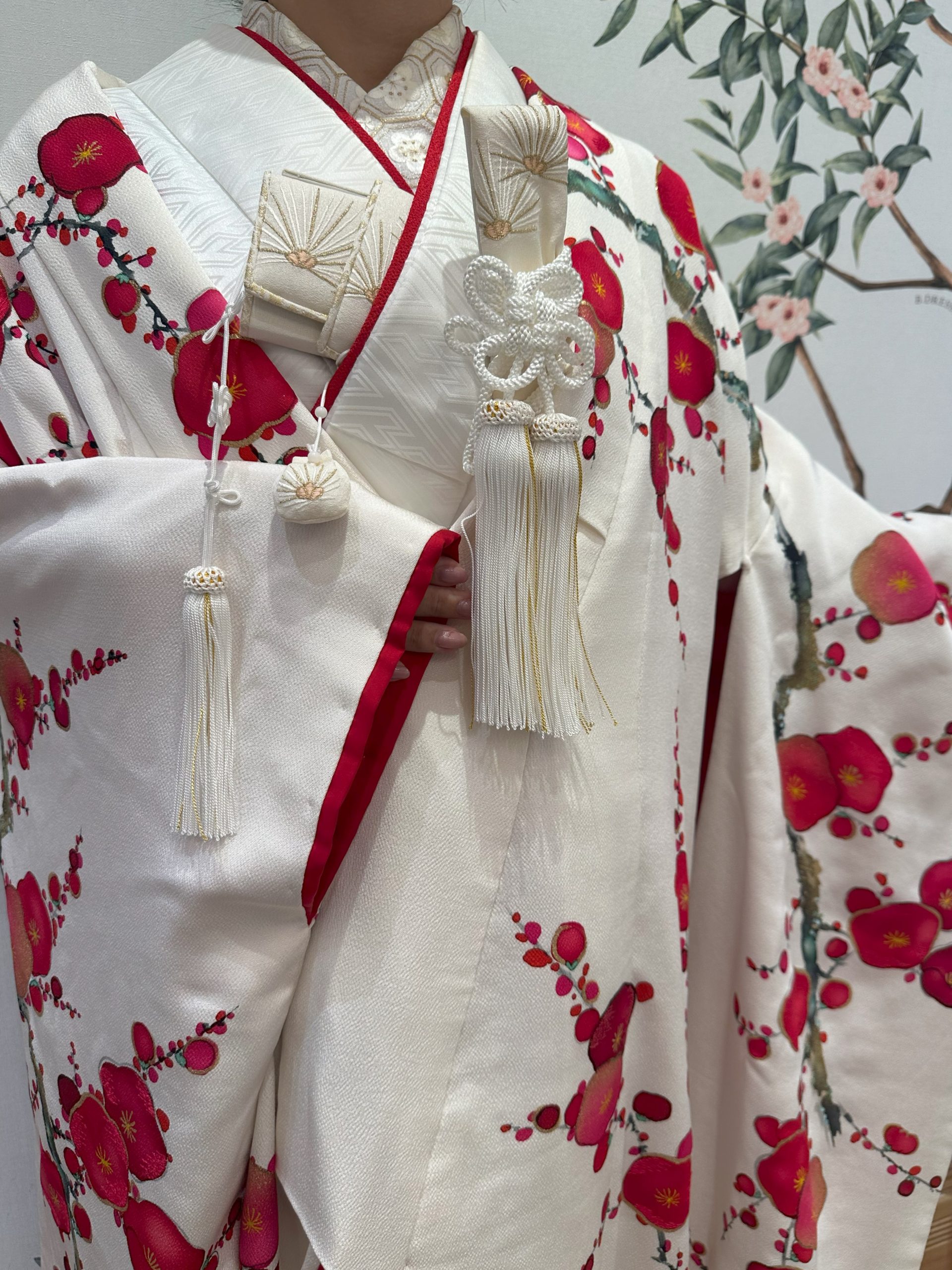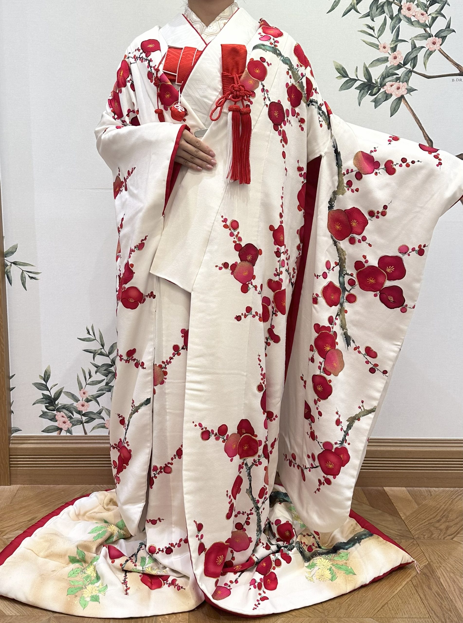 緻密に計算され、滑らかで美しい梅柄が鮮やかに彩られたデザインは、凛と佇んだ花嫁を包み込むように華を添えます。