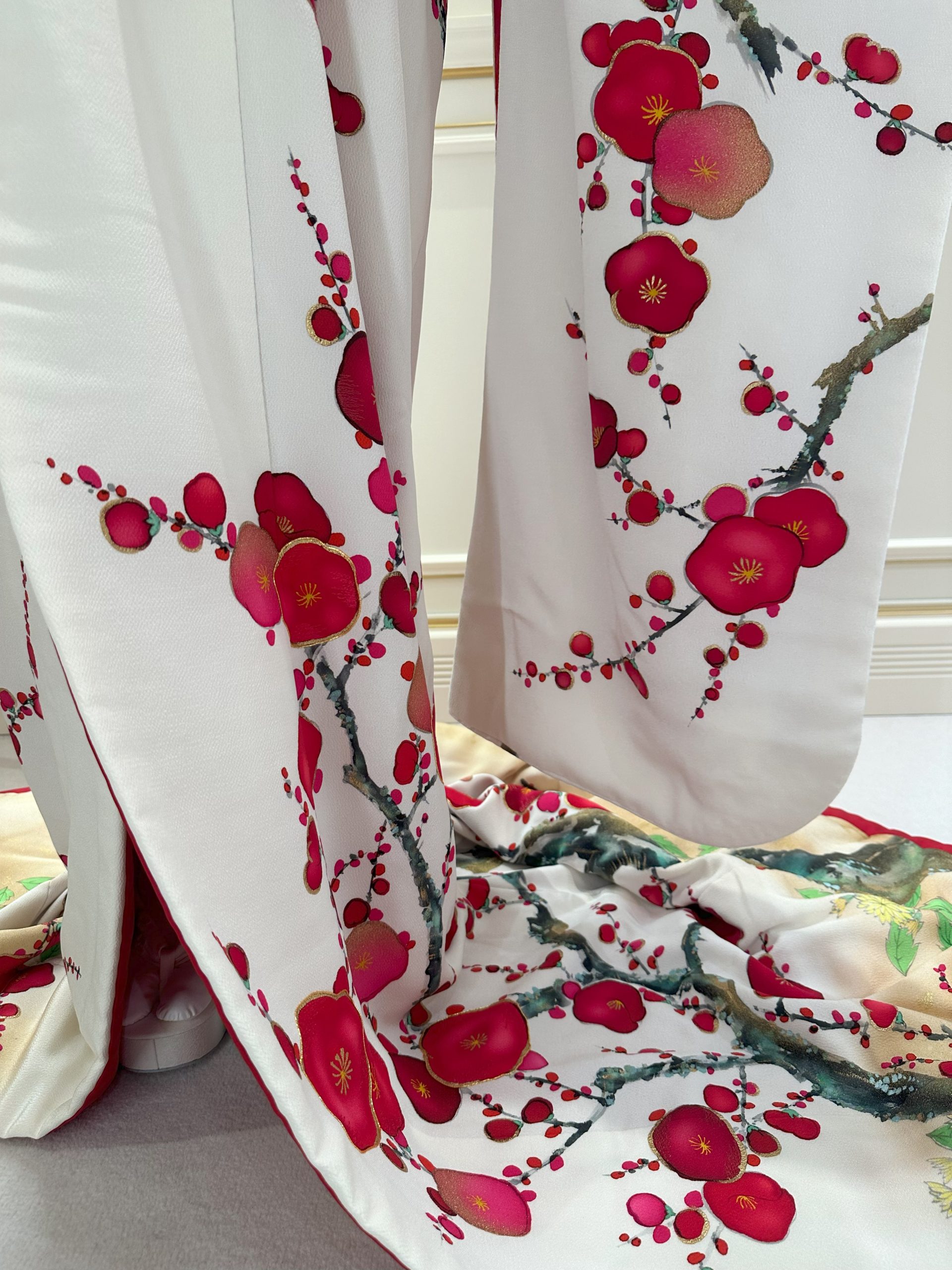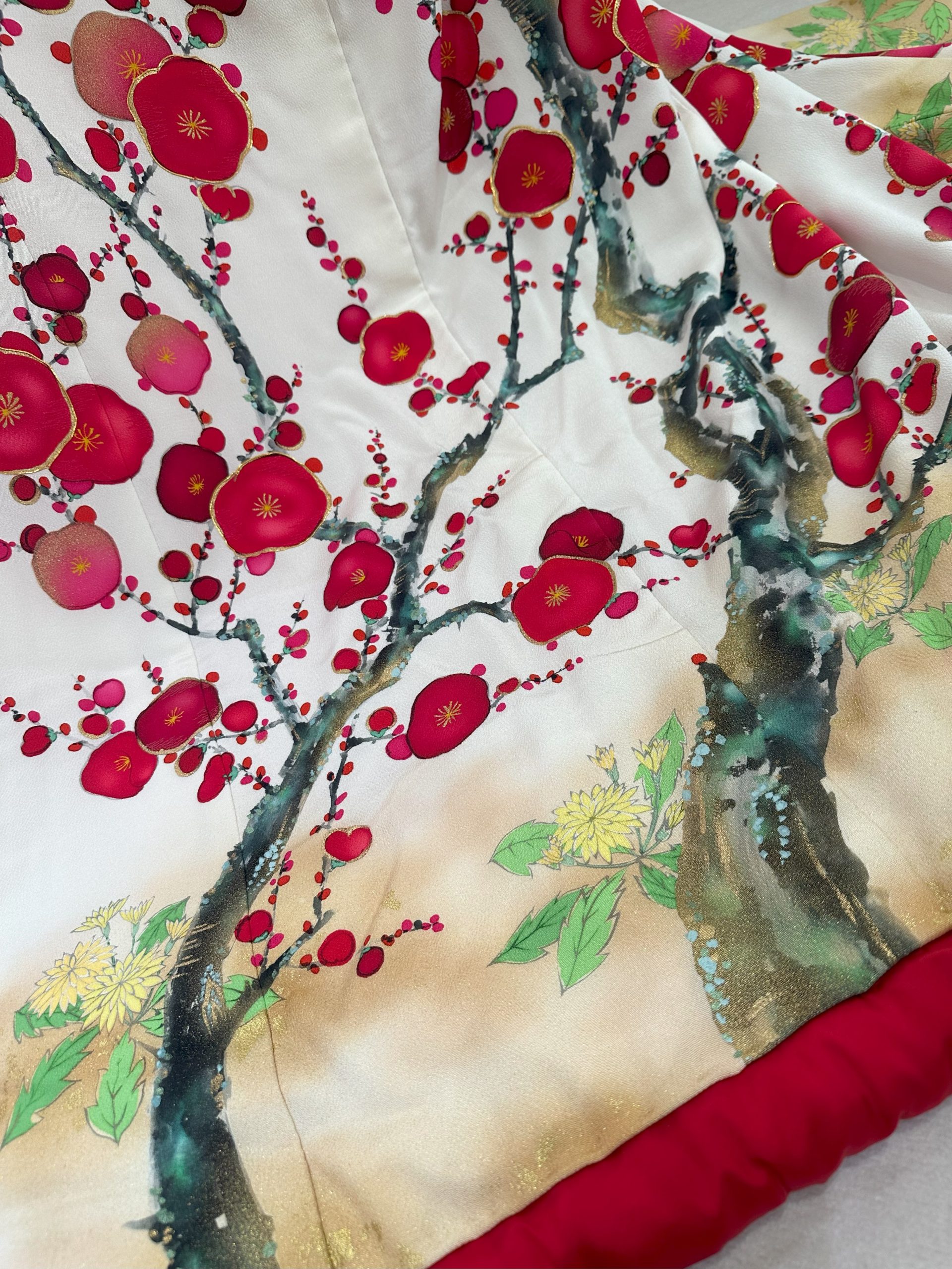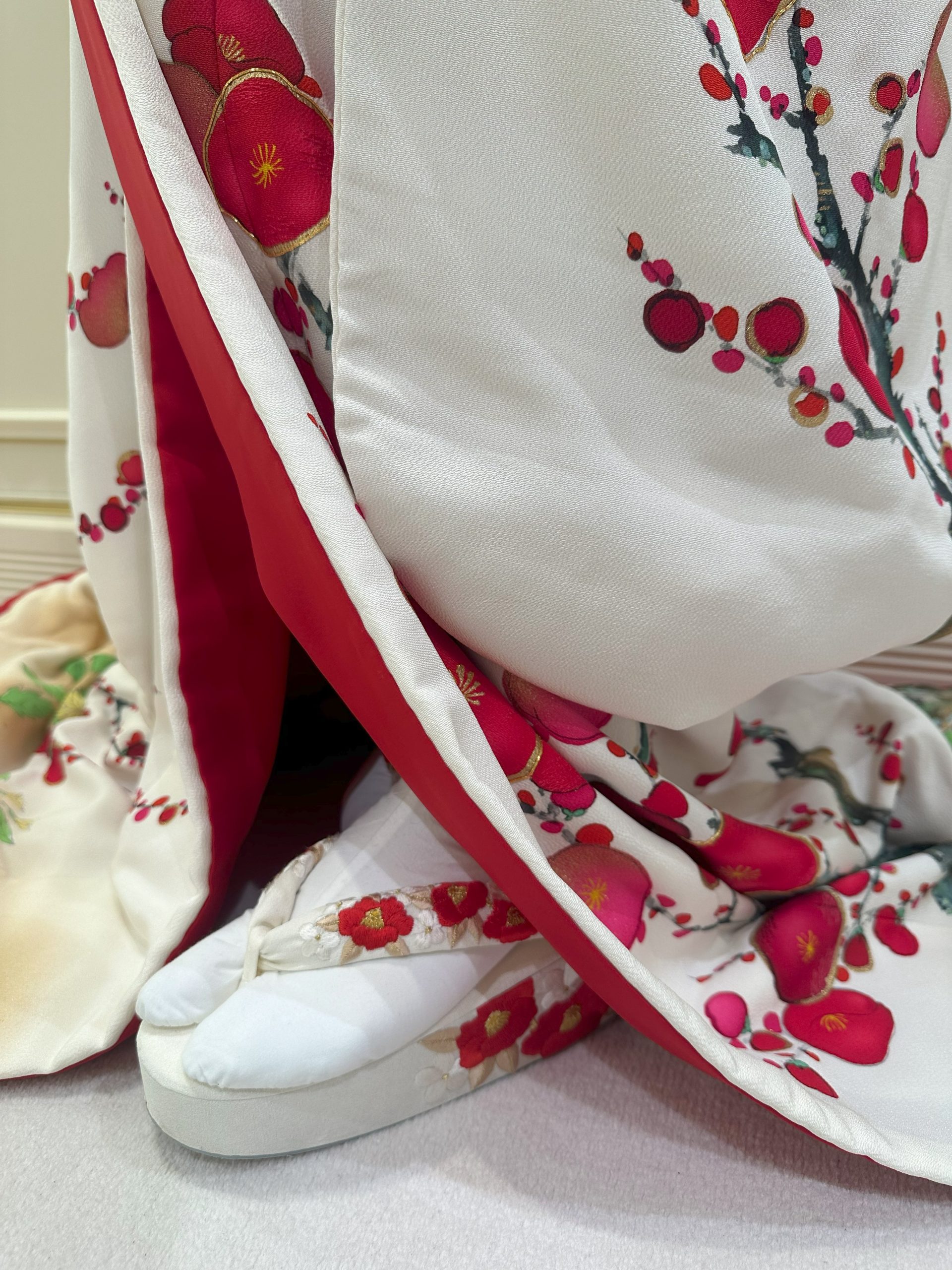 緻密に計算され、滑らかで美しい梅柄が鮮やかに彩られたデザインは、凛と佇んだ花嫁を包み込むように華を添えます。