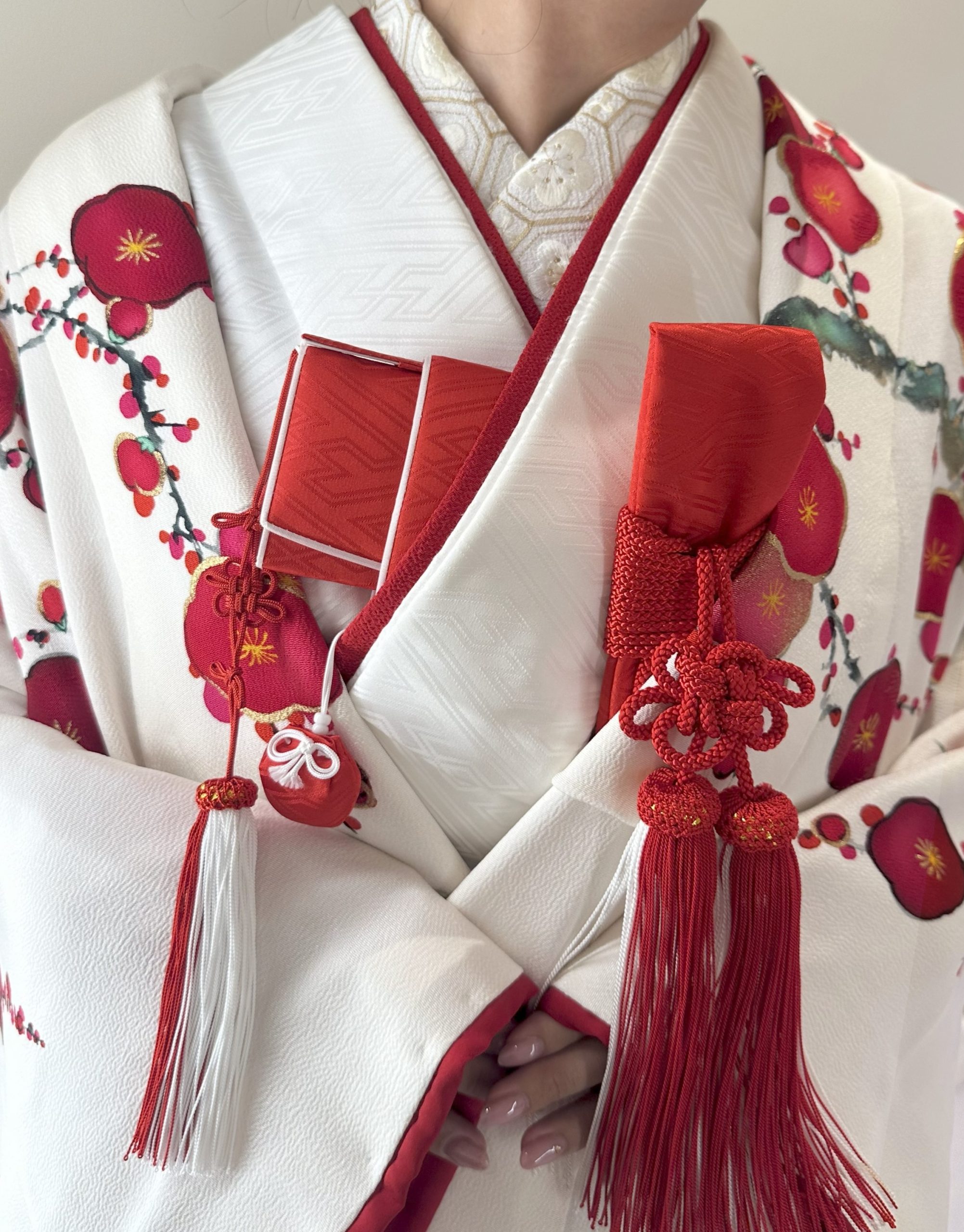 梅柄の赤色と合わせるようにを胸元に添える懐剣や箱迫に赤を取り入れることで、統一感を大切にした装いになります。
