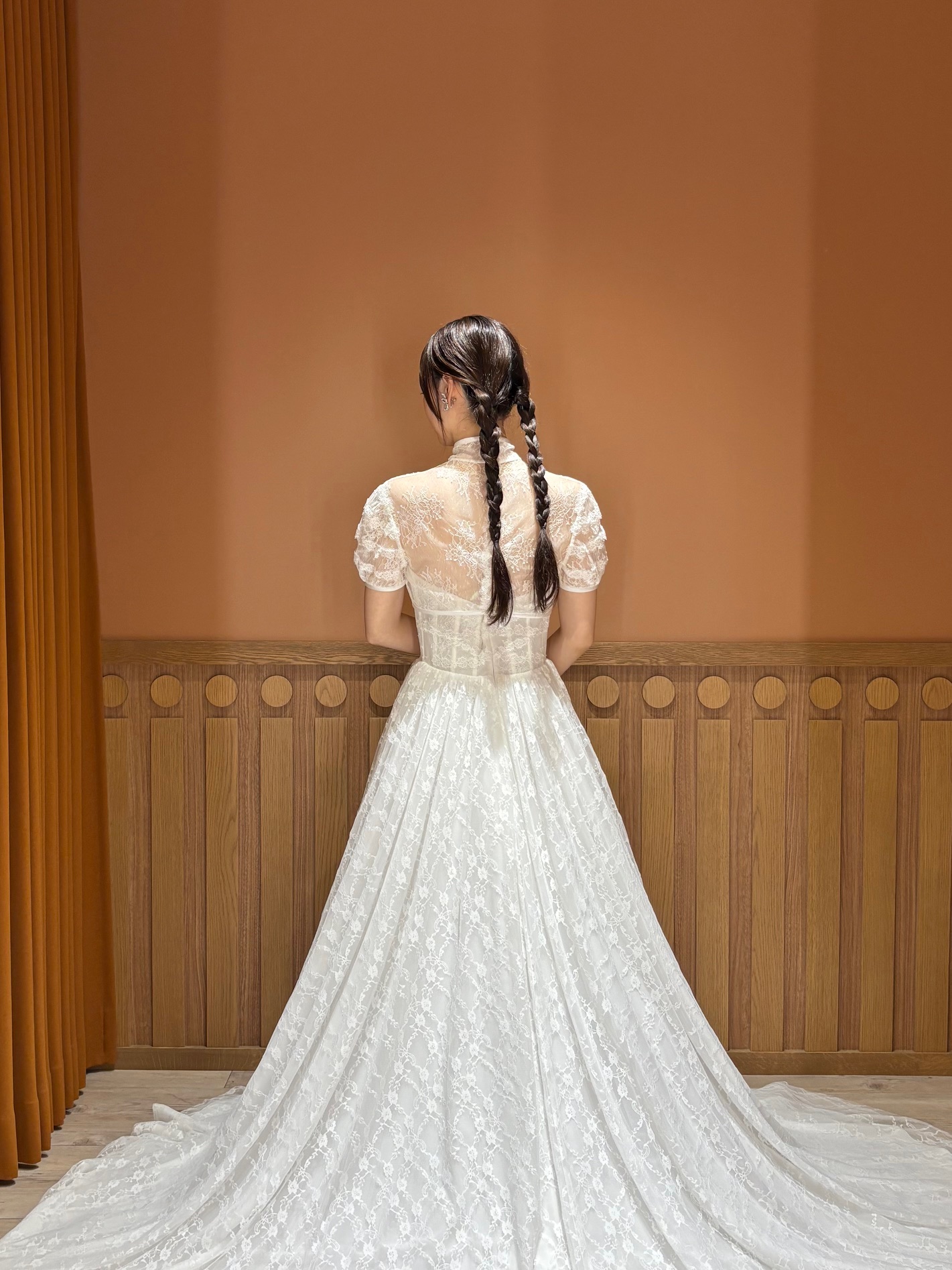ボリュームレスで軽やかなフォルムのドレスだからこそ、編み込んだツインのダウンスタイルに、ショート丈のヴェールを合わせてアイキャッチでフェミニンな印象を与えるブライズスタイルが完成します。