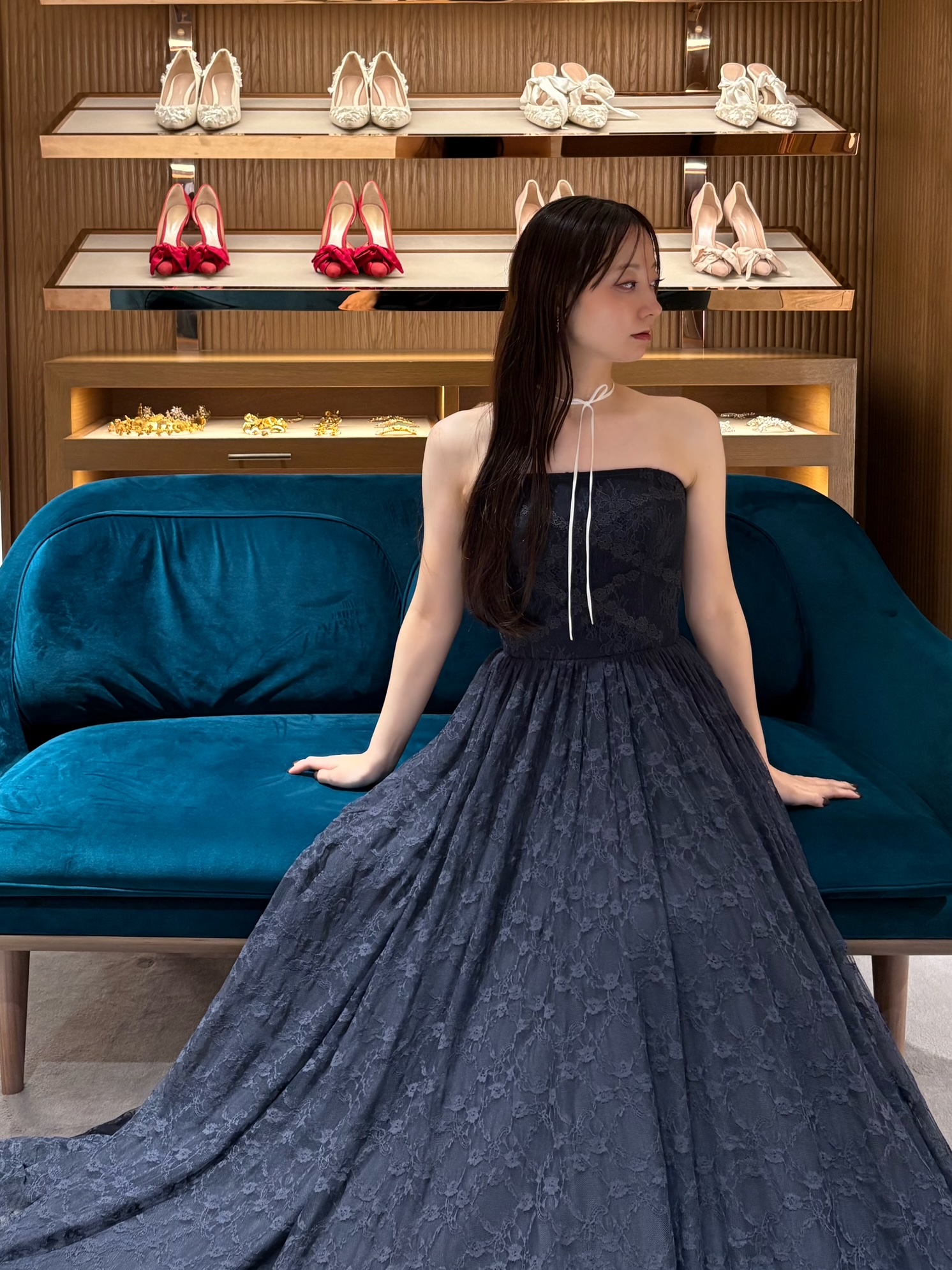 ドレスの色味と対照的なホワイトの華奢リボンが揺れ動くネックレスを合わせて、ダークなロマンティシズムを叶えるコーディネートに。