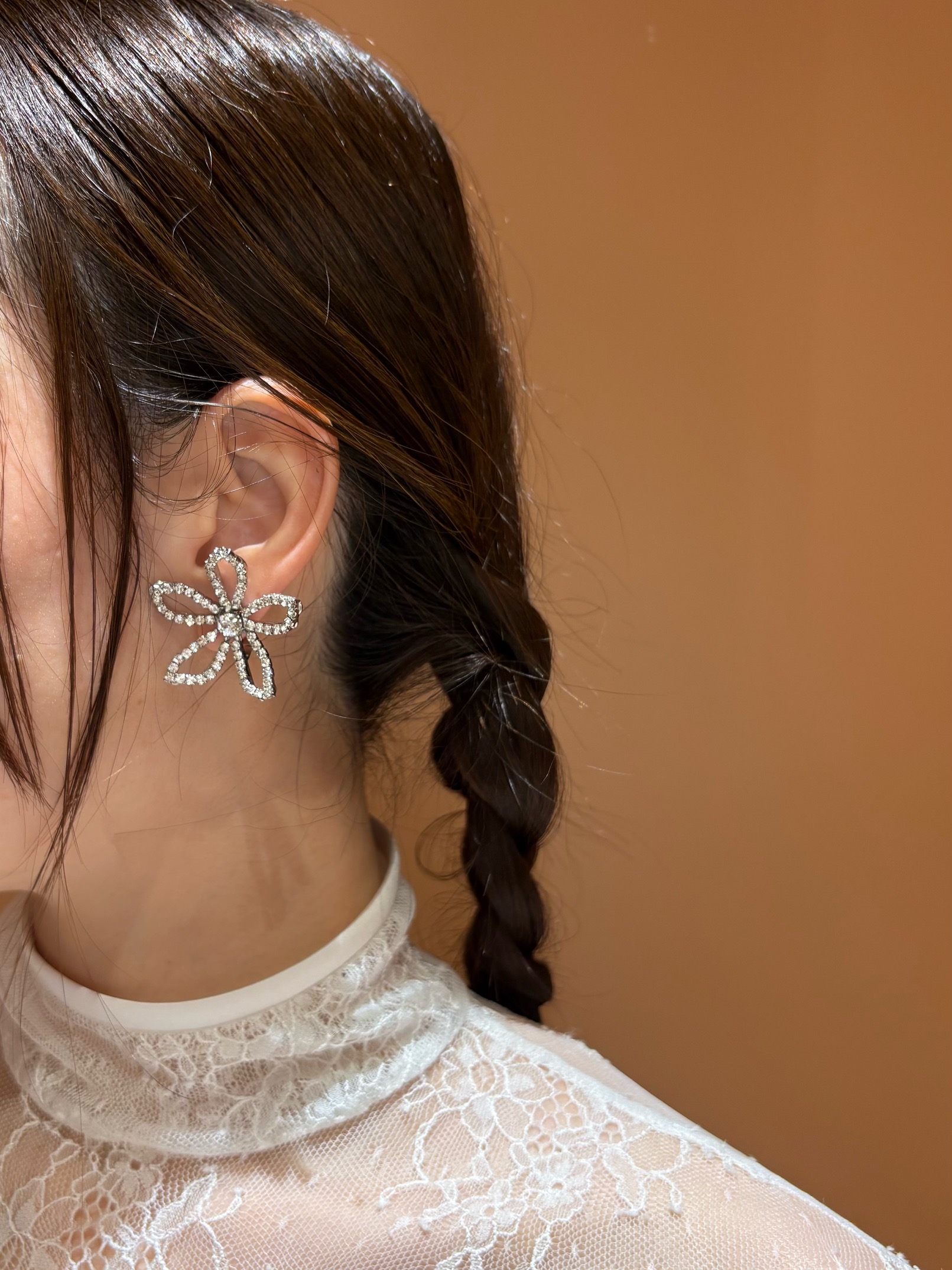 イヤリングは、クリスタルの繊細な煌めきに心奪われるオープンフラワーのデザインを合わせて特別なひとときを演出します。