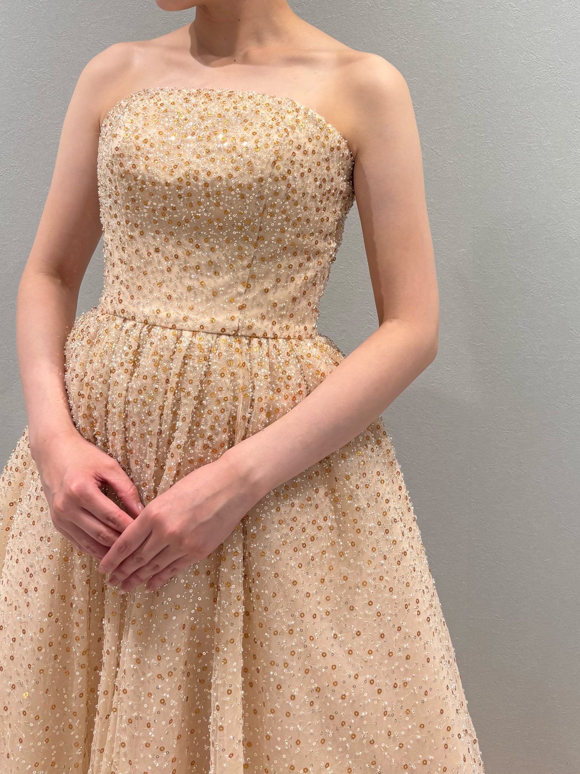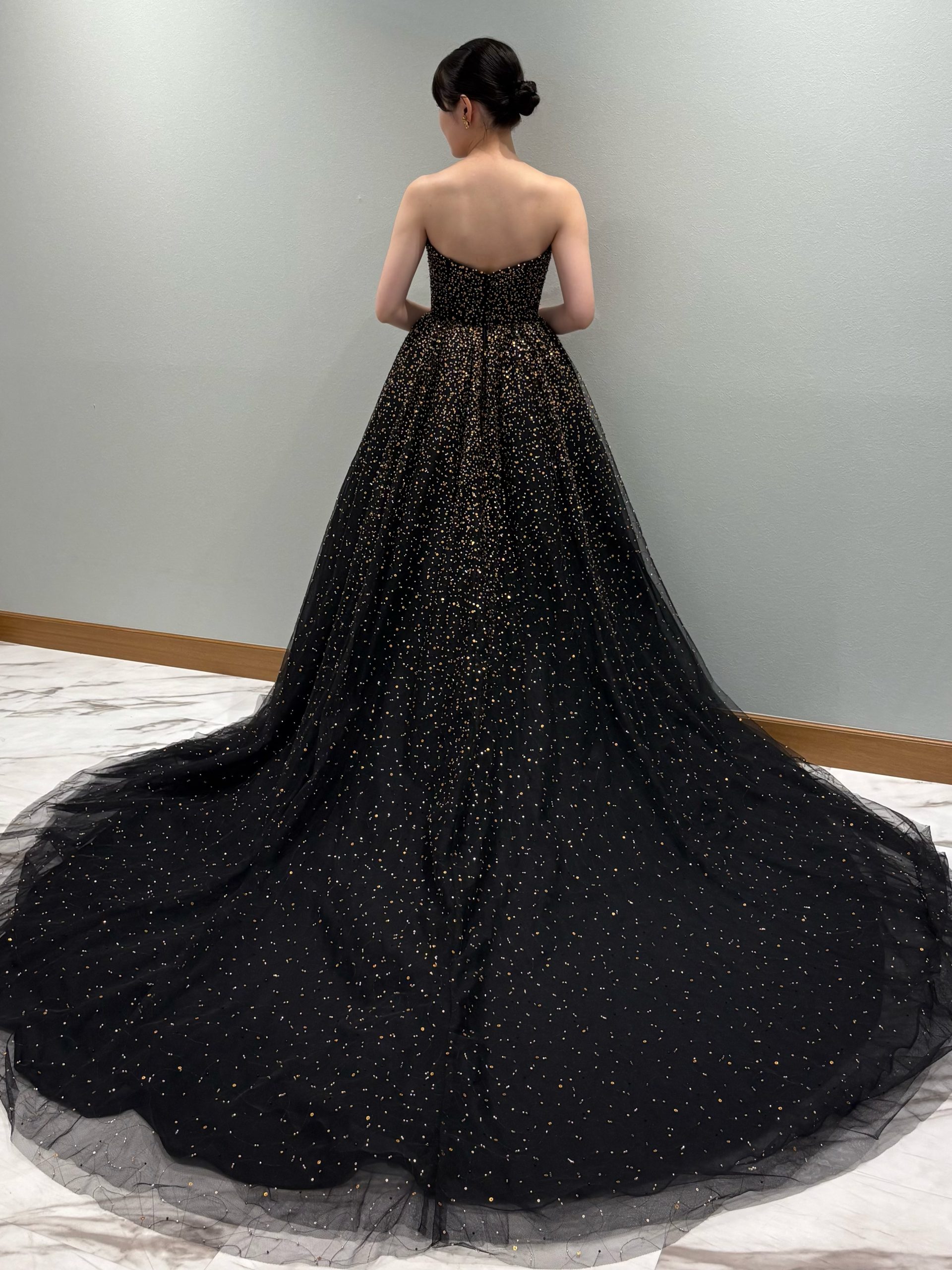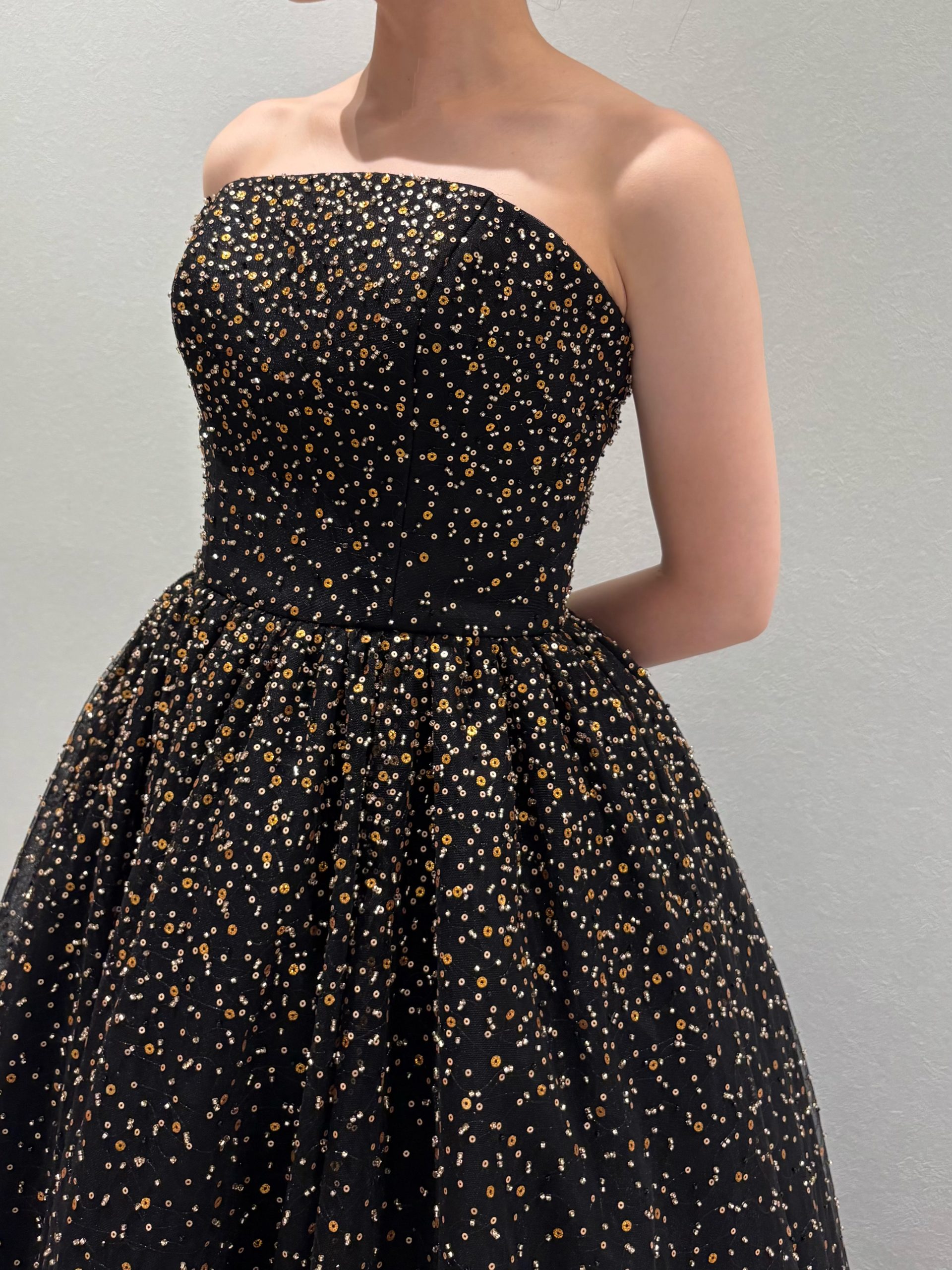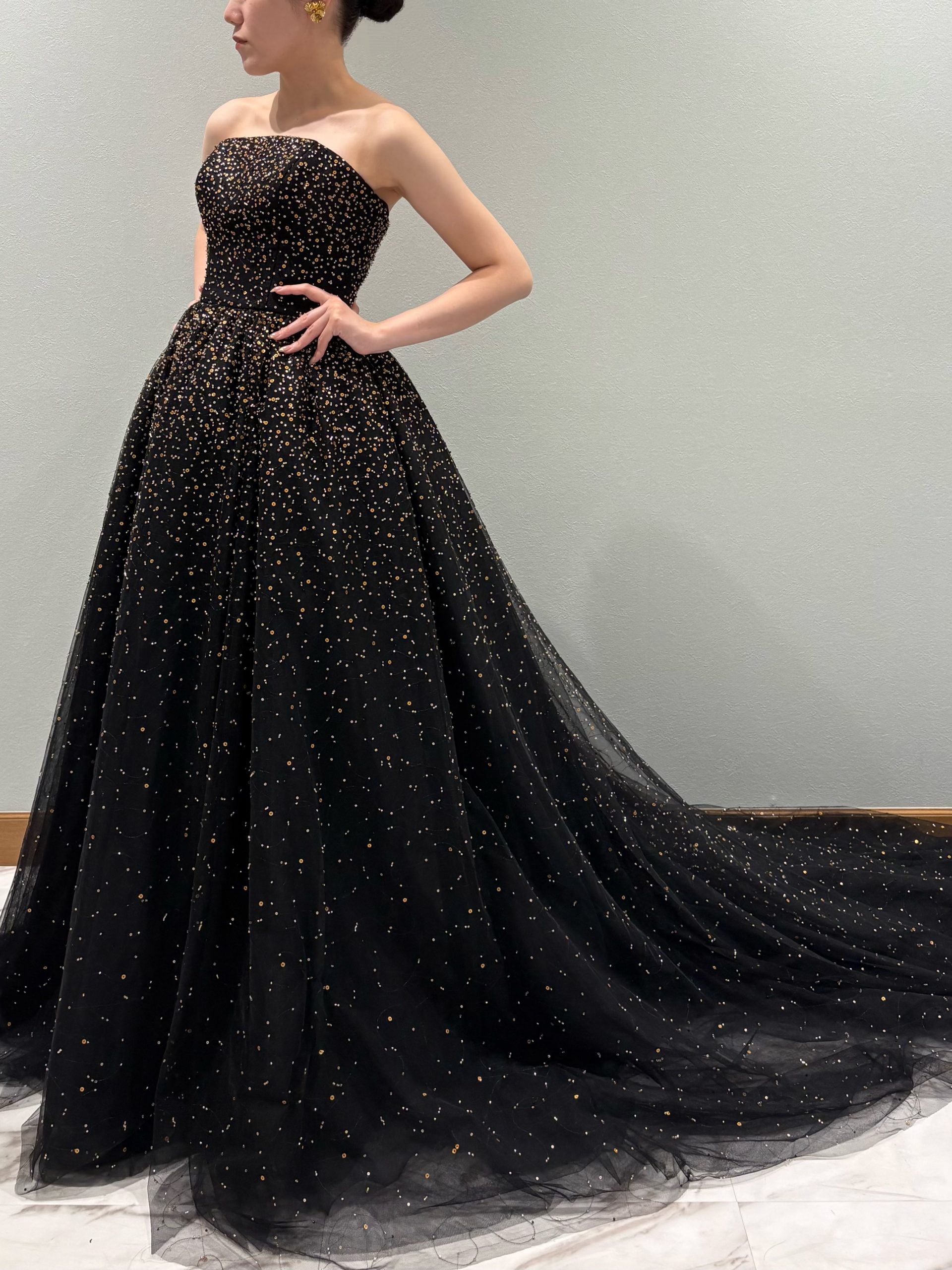 ブラックのチュールスカートに煌めくスパンコールやビーディングを贅沢にあしらい、精巧なディティールが織りなす一着は、大人の洗練を纏えます。