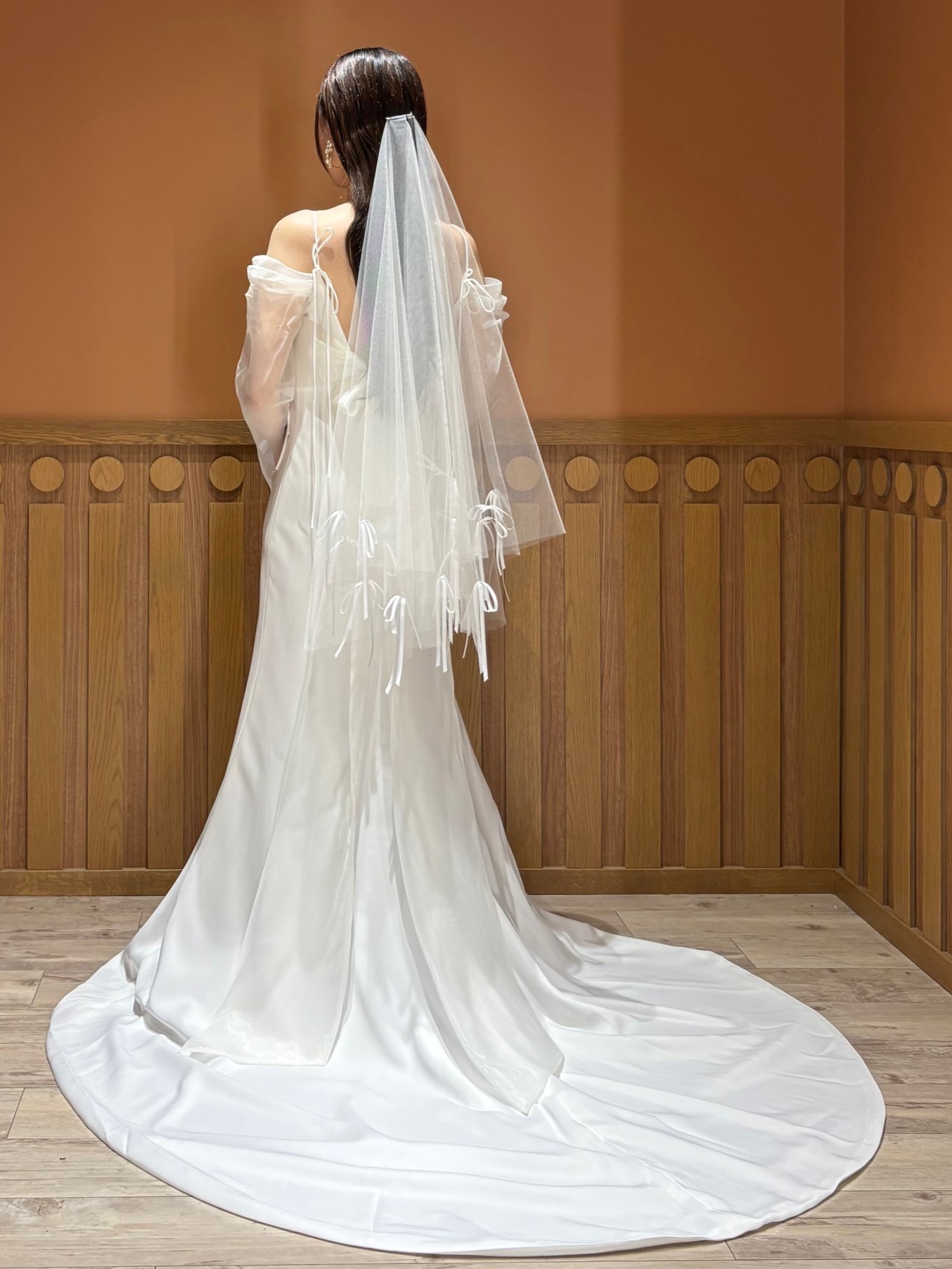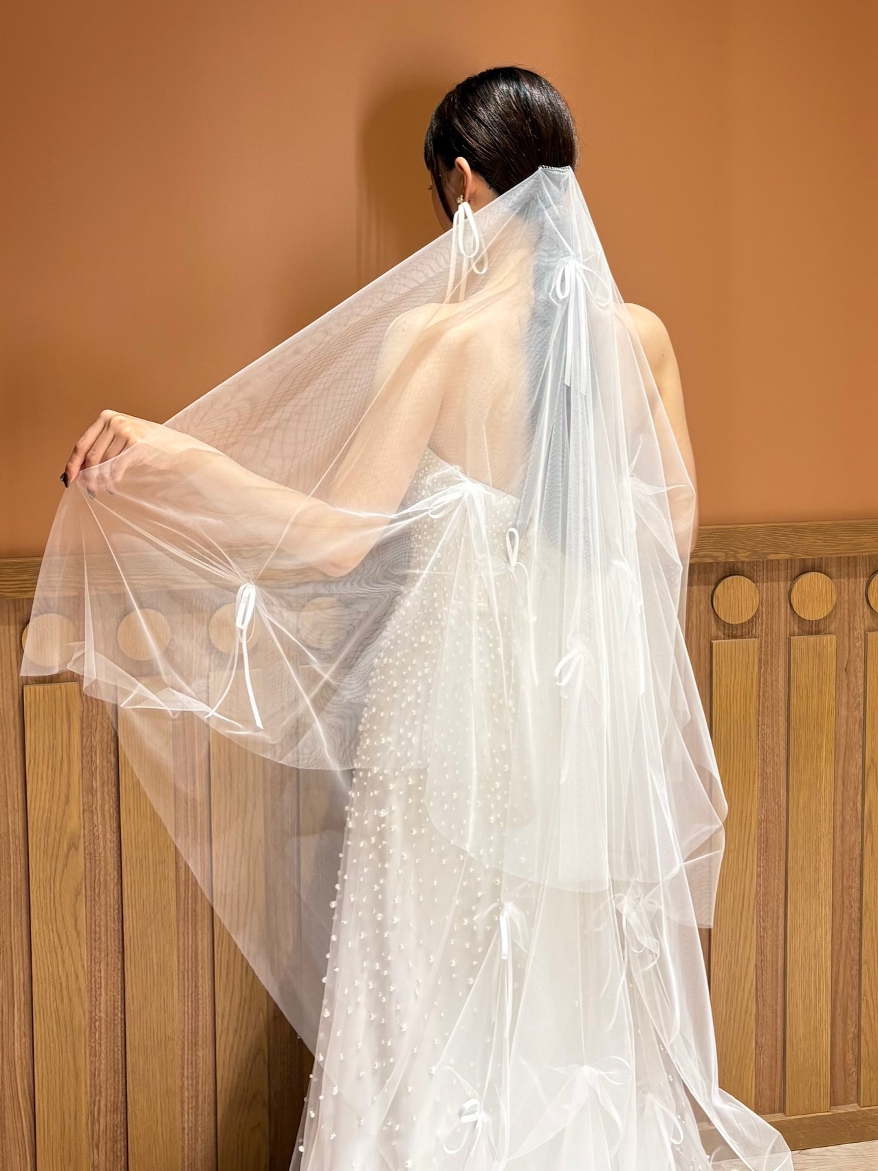 こちらのヴェールは、ランダムに飾られた華奢なリボンが繊細な透明感とチュールの柔らかさを引き立て、たっぷりとリボンがあしらわれながらも、そっとドレスに溶け込むようにデザインされています。