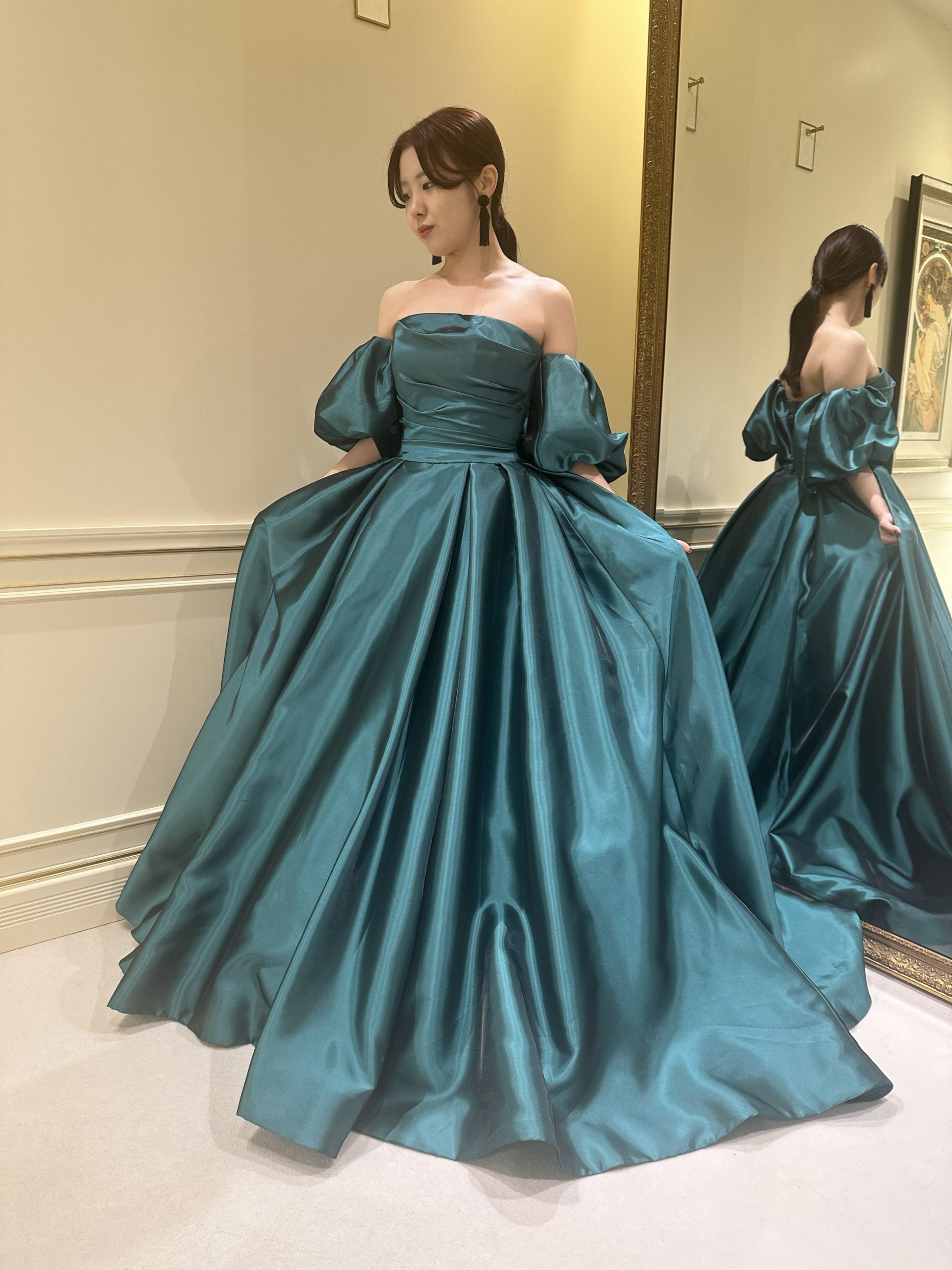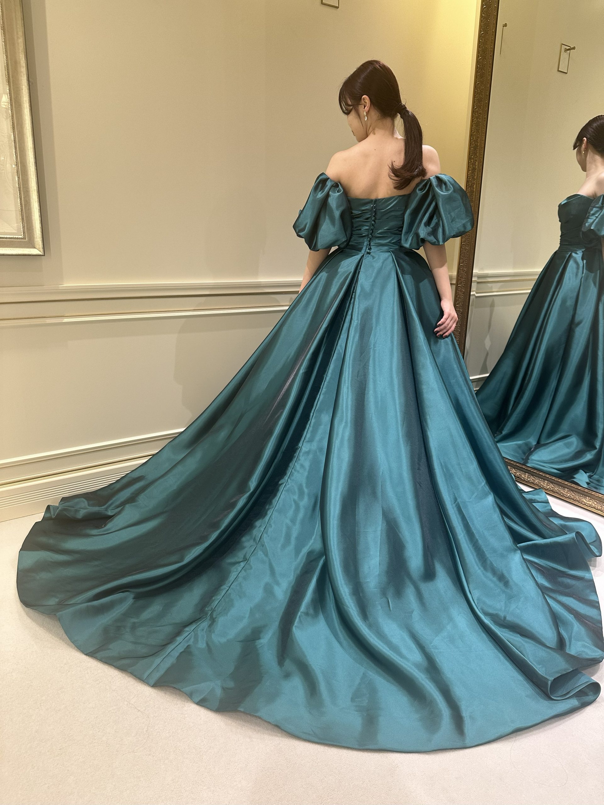 都会的な印象を感じさせる鮮やかなグリーンが深みを出し、たっぷりと光を浴びた際には艶やかな光沢感を放つ、凛とした大人な印象を与える一着。