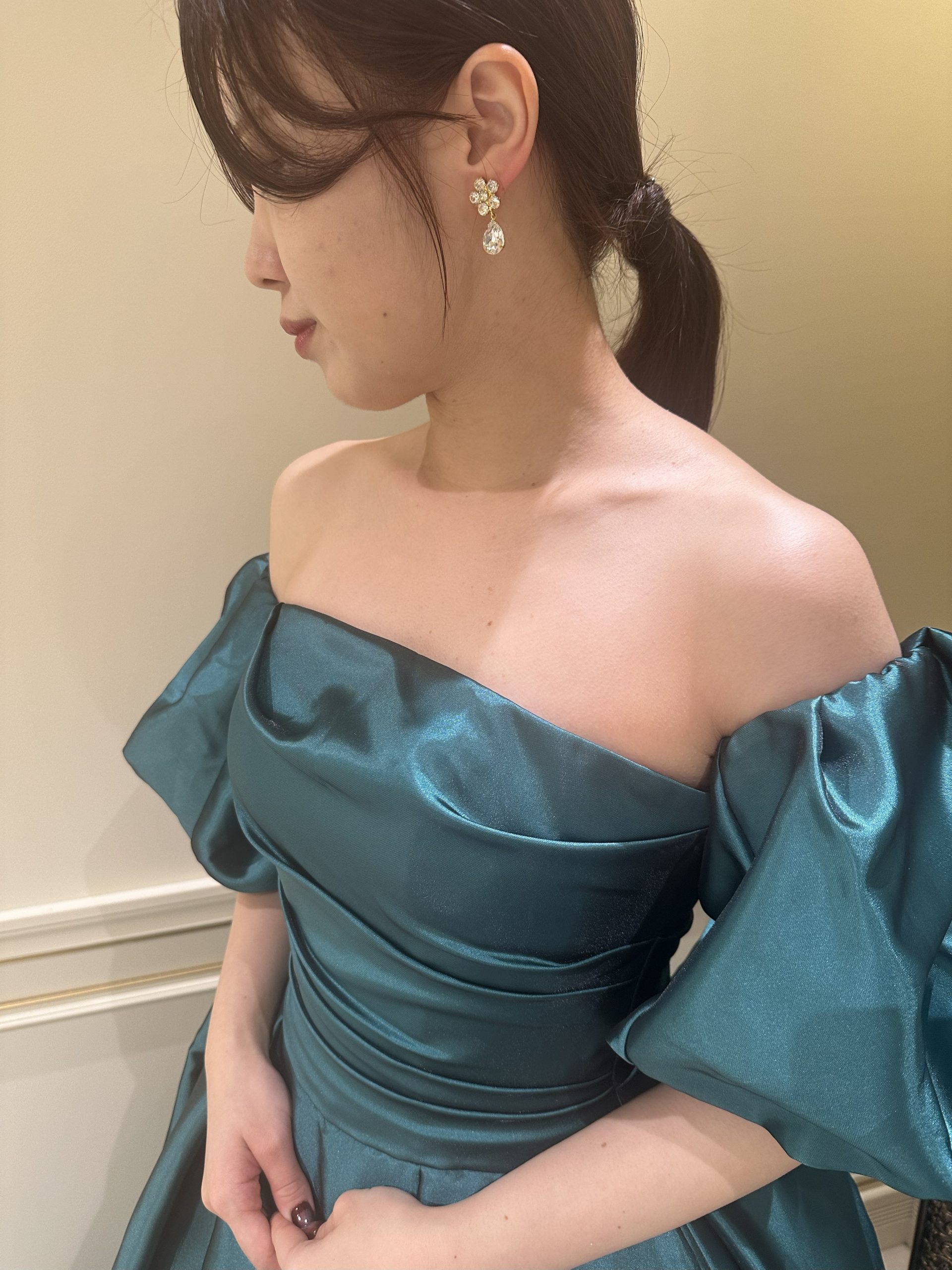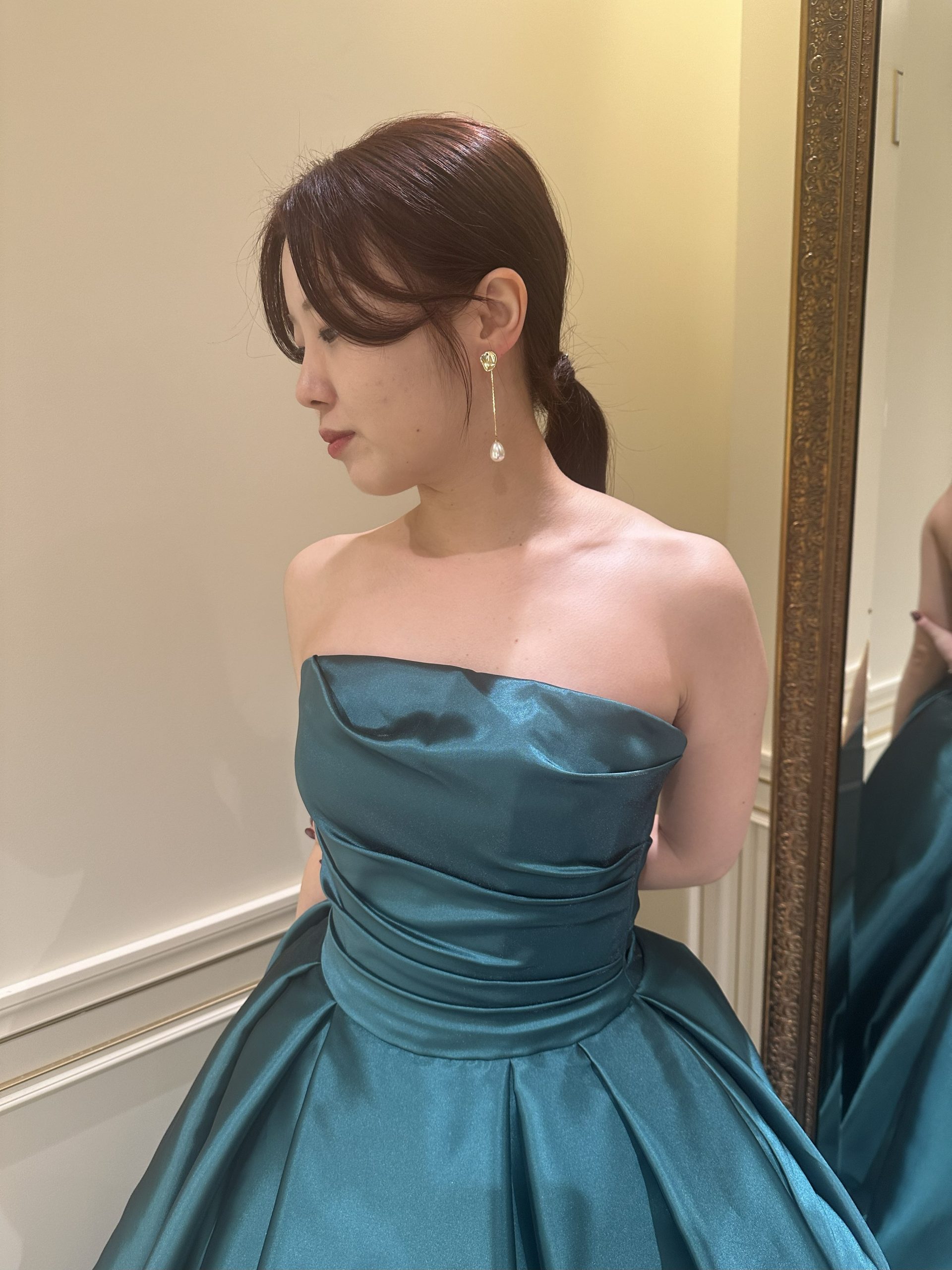 ドレスに一切の装飾がないからこそ、洗練された細部のディティールが光る美しさと、艶やかなカラーをさらに引き立てるように、耳元で光り輝くイヤリングが、優しく控えめでありながら潔く凛とした佇まいを演出します。