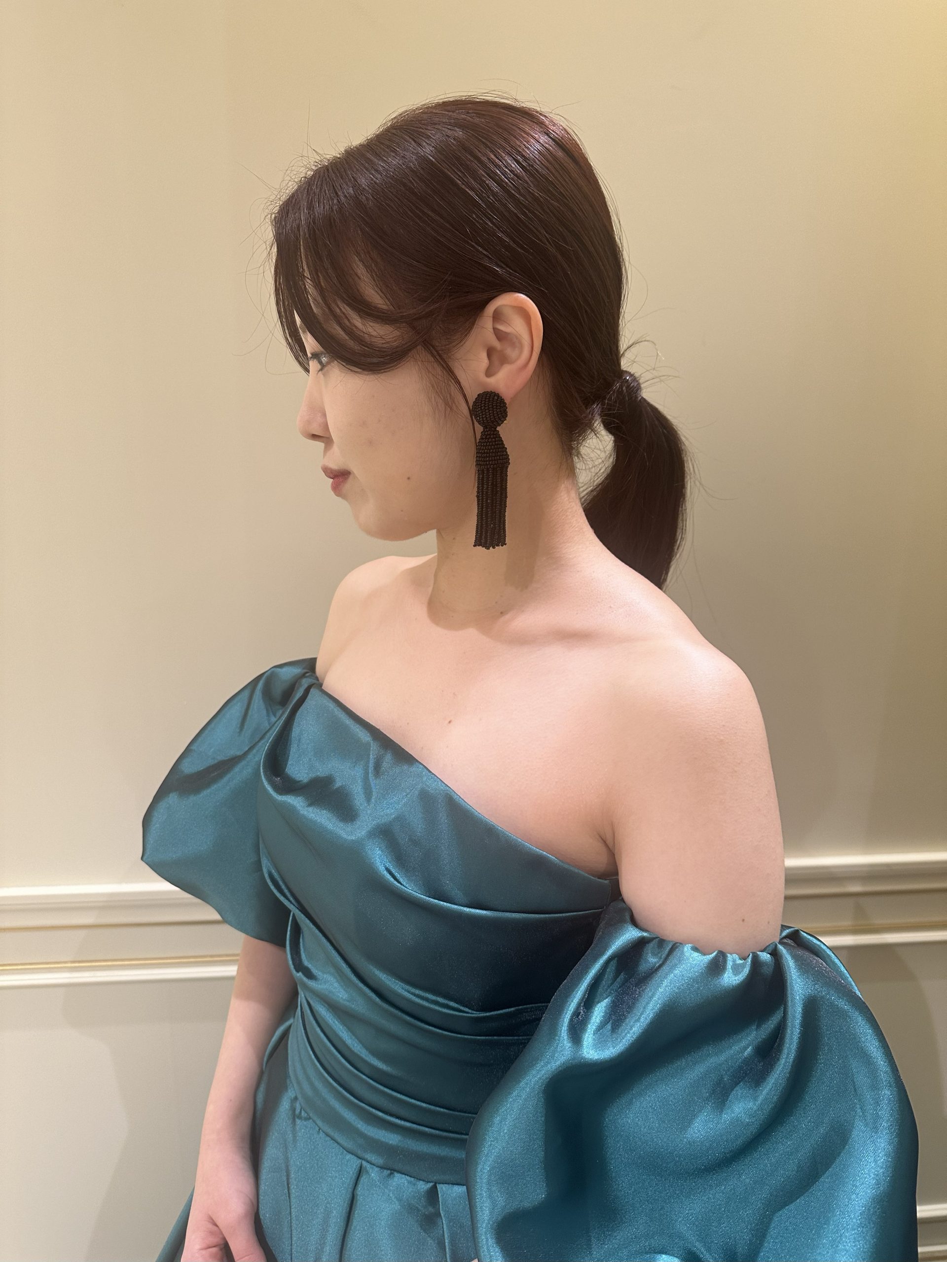 花嫁様それぞれのパーソナリティや気分を表現し、顔周りを華やかに彩るイヤリングだからこそ、アイキャッチーでコーディネートのポイントになるブラックのイヤリングを合わせることによって、ラグジュアリー感漂うファッショナブルなスタイルを作り上げます。