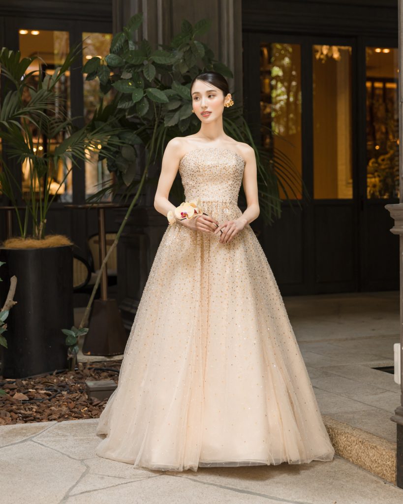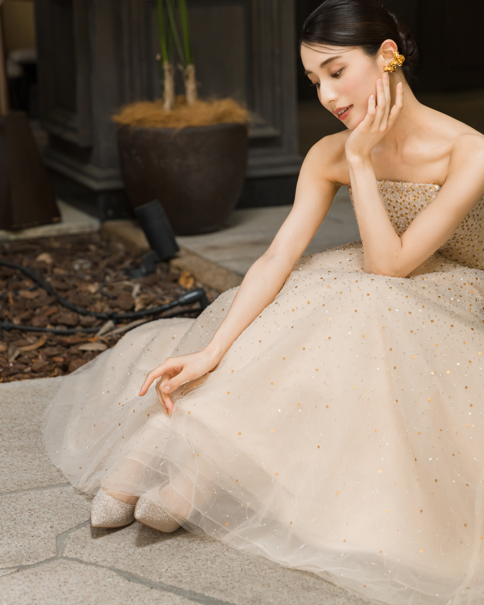 チュール、グリッター、スパンコールが織りなす色の重なりが絶妙で、ボリュームたっぷりのスカートが贅沢な存在感を誘います。都会的な会場でお召しいただくと、上質さの中にファッショナブルなエッセンスを宿します。