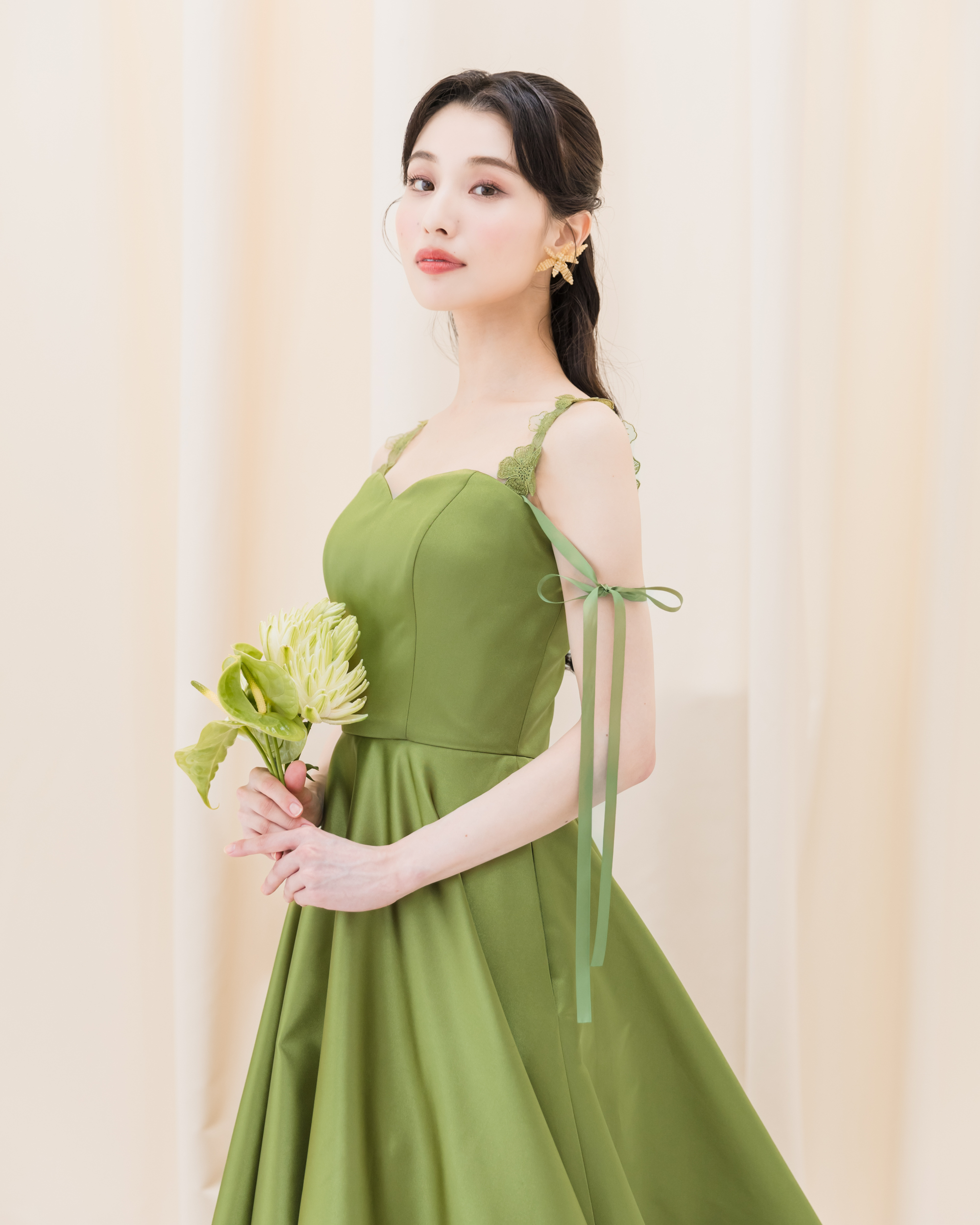 上質な艶とハリが美しいピスタチオカラーと迷いのない直線を描くAラインの美しさが絶妙にマッチし、花嫁を輝かせます。印象的なリボンディティールは、自由なアレンジを楽しむことができ、歩くたびに表情が変わる愛らしさを作り出します。