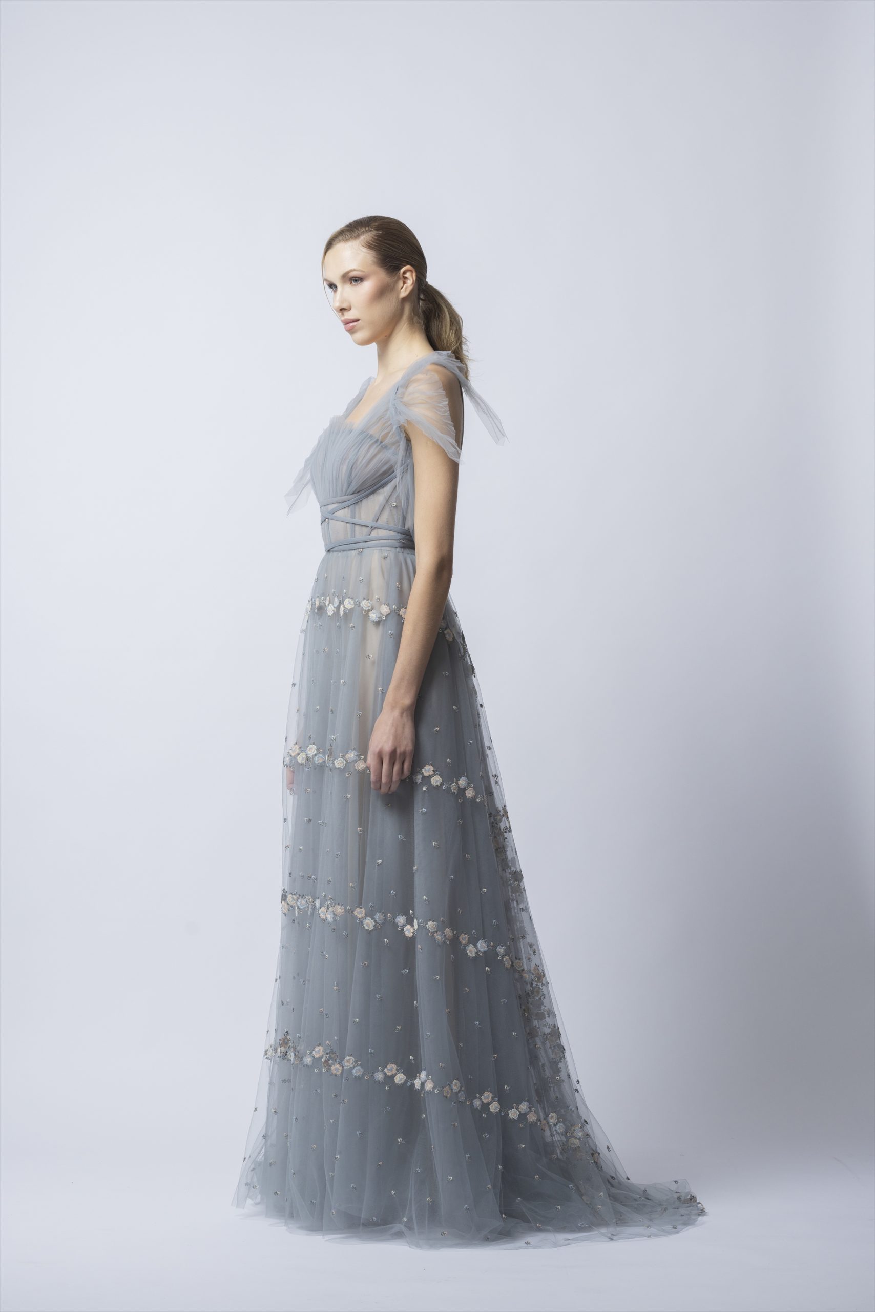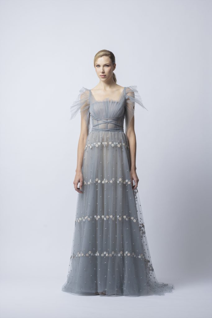 パウダリーなブルーがこの上ない透明感を感じさせ、贅沢なほど柔らかいタッチでどこか夢の中にいるような幻想的な雰囲気を漂わせた一着。シアー素材に施された繊細な刺繡がナチュラルでいて、柔らかなチュールが軽快に揺れ動き、花嫁を心地良く包み込みます。