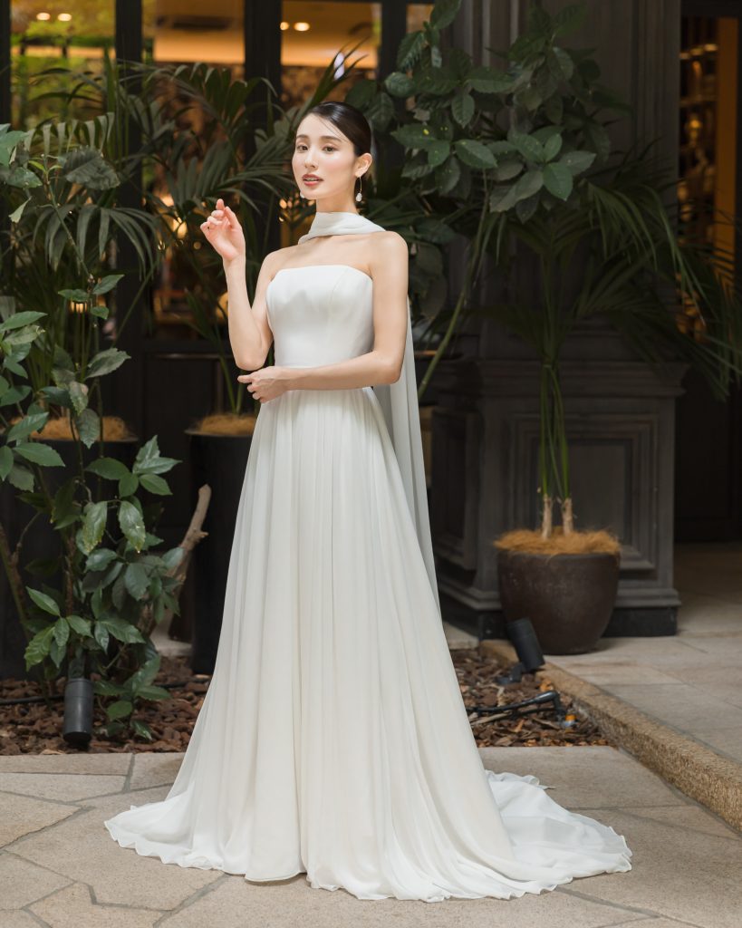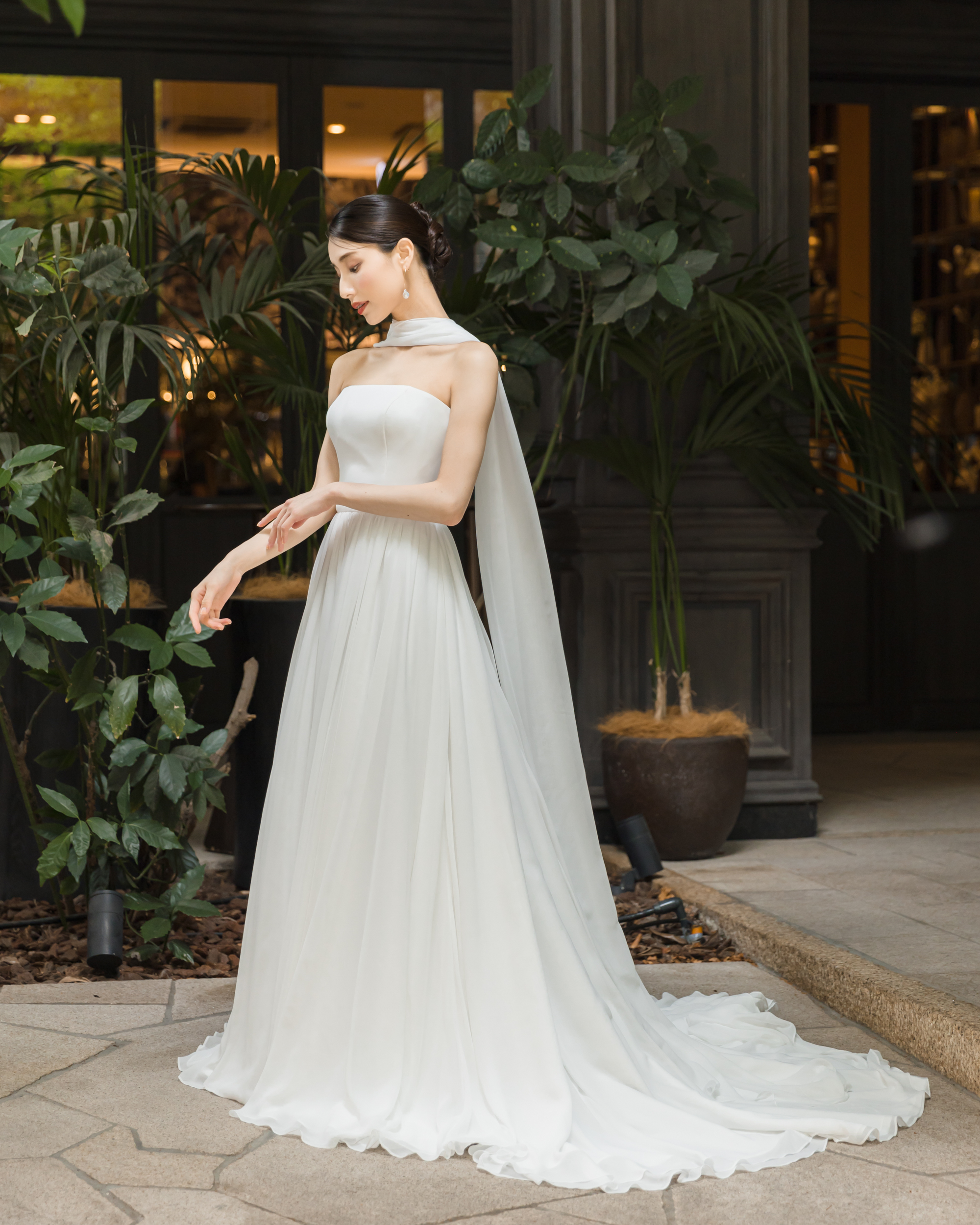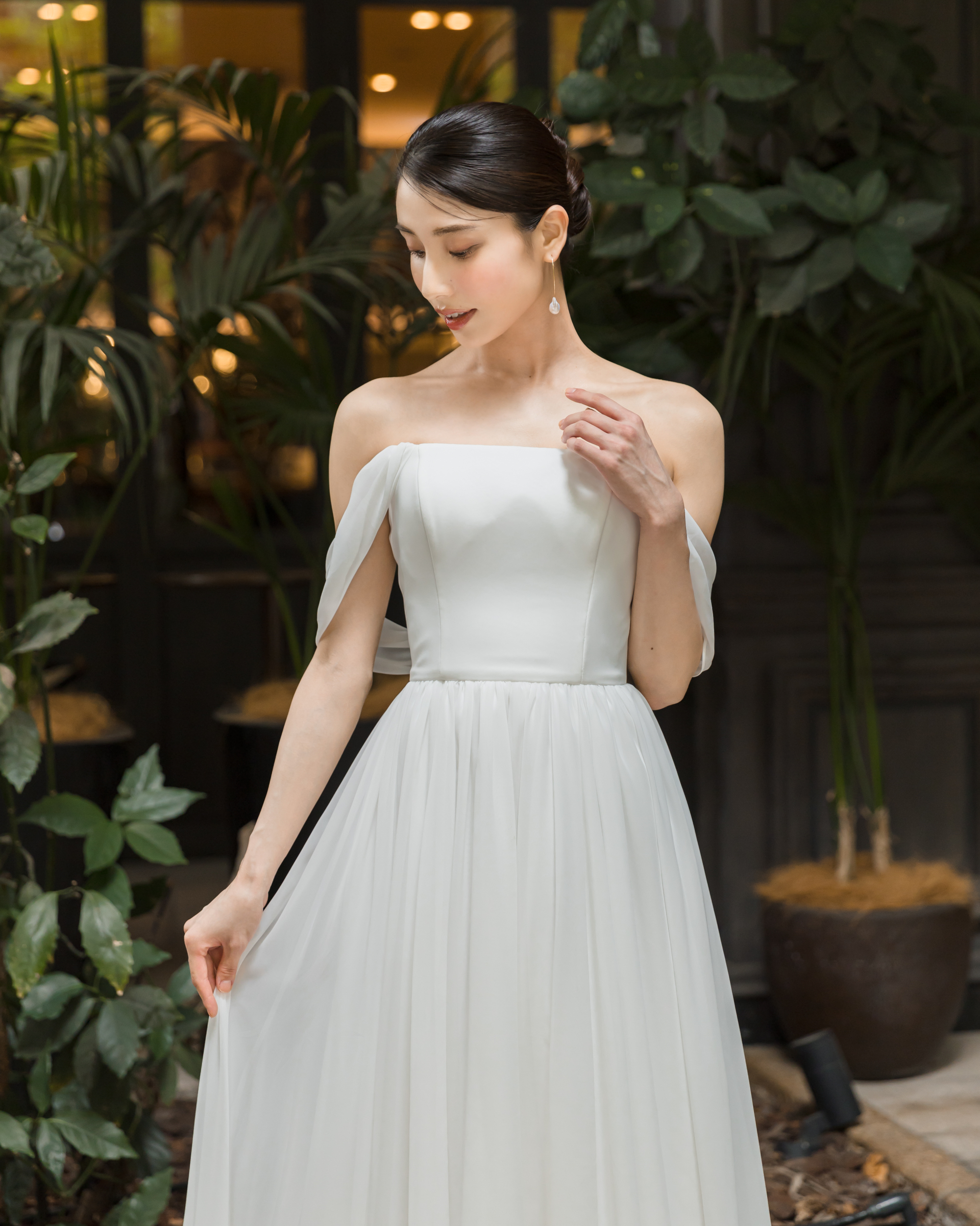 名前の通り、おもちみたいに柔らかい質感で、優しいフォルムに透き通った⾊味が特徴の⼀着。シンプルでありながらも⼤胆なドレープがしなやかに着こなせるAラインのドレスです。繊細に揺れるドラマティックなジョーゼットのスカーフであなただけのコーディネートを楽しめます。