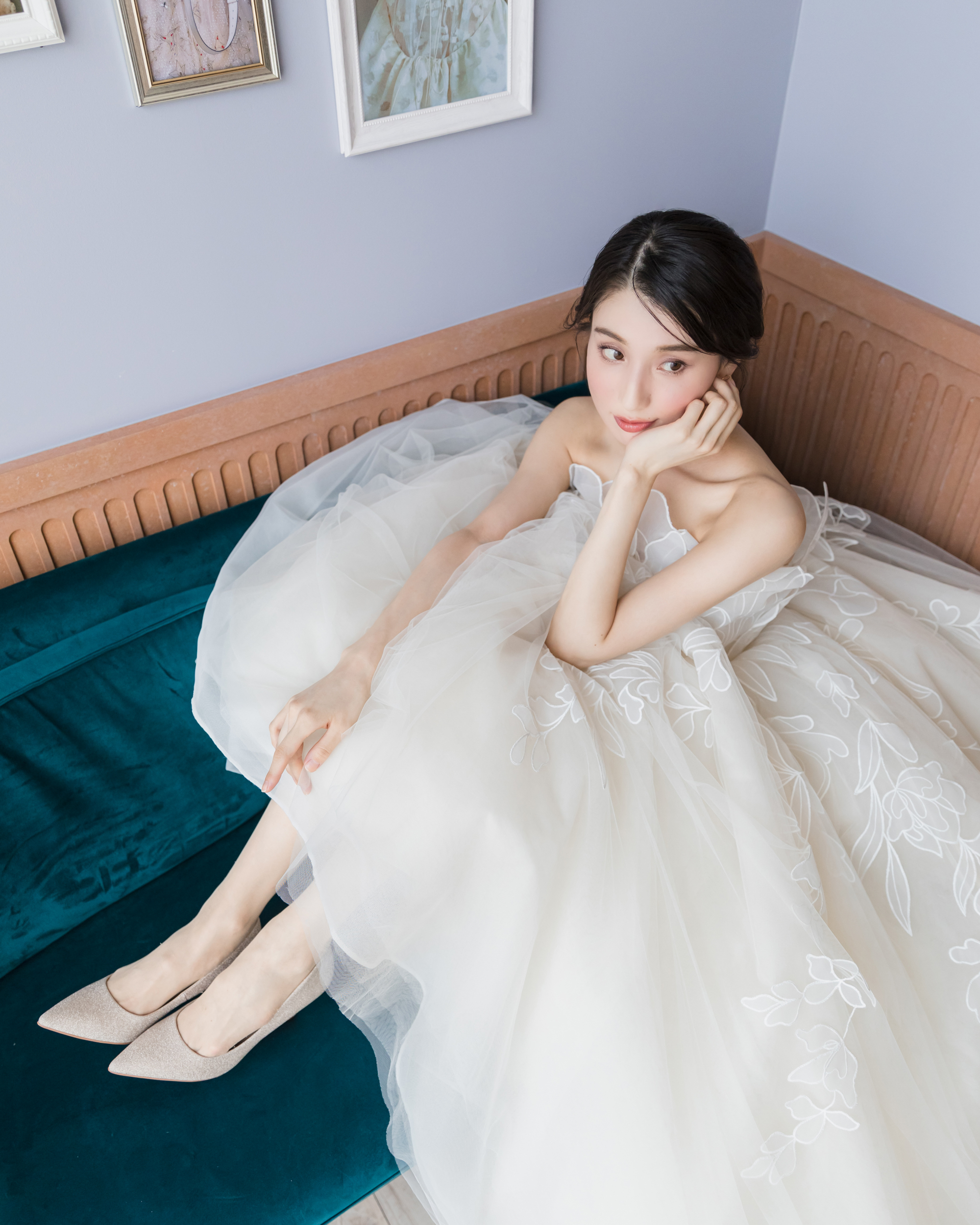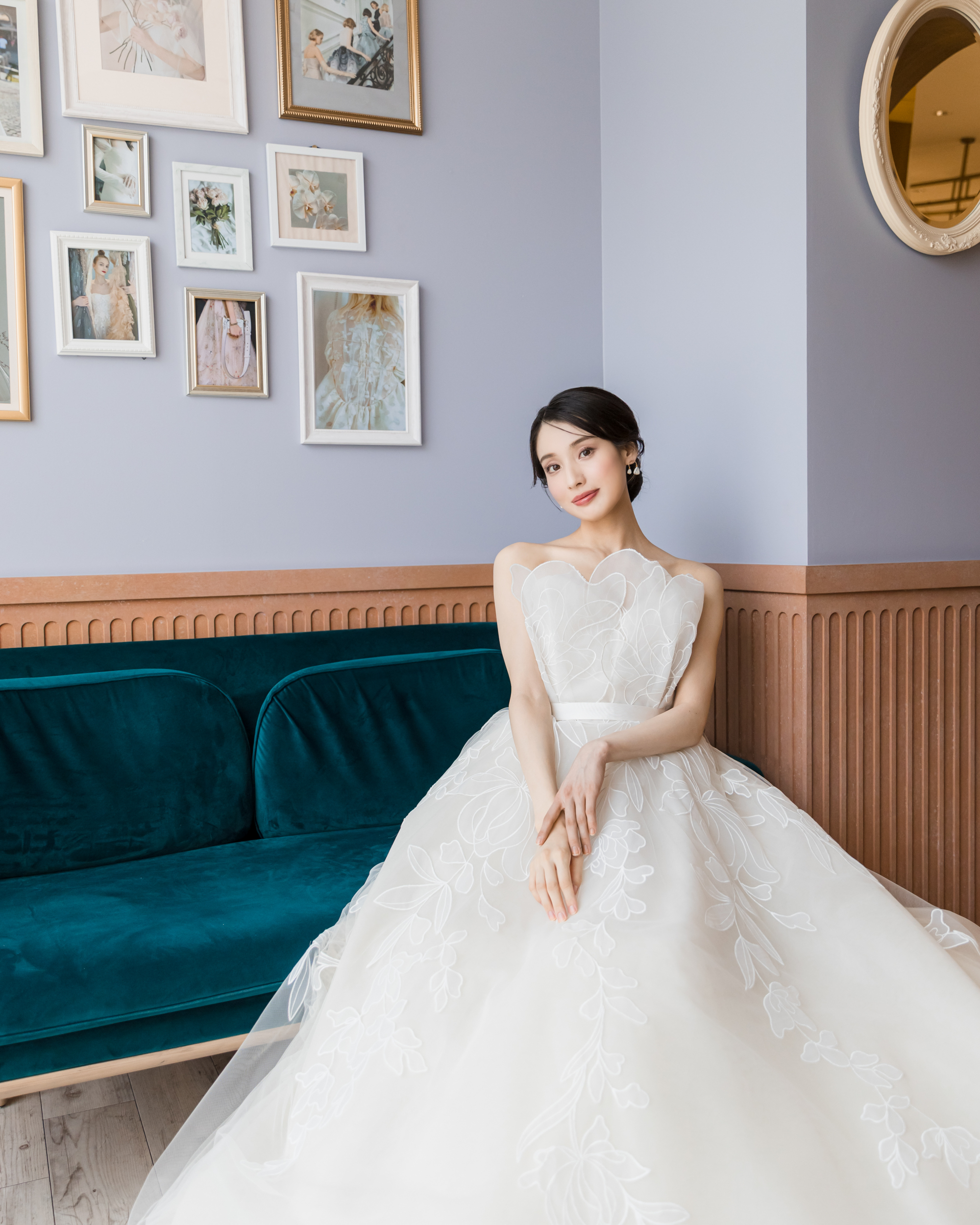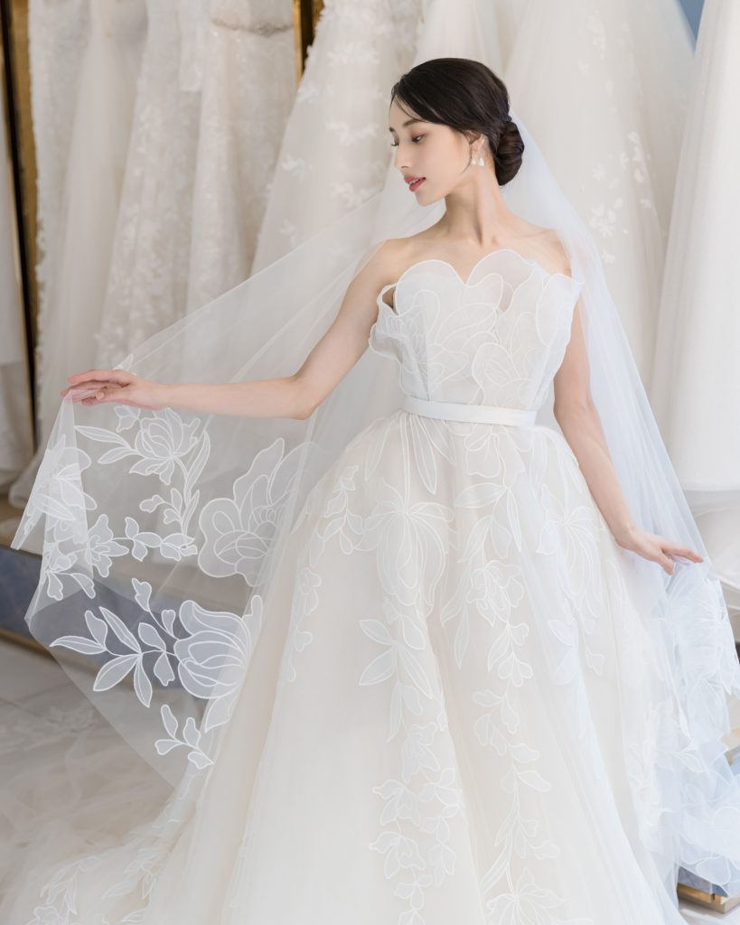 胸元に生き生きとした花が咲き誇るかのような端正な美しさは思わずため息がこぼれるほど。透明感に溢れ、フェミニンで可憐な雰囲気で花嫁を包み込み、特別な日に相応しいラグジュアリーさを演出します。セットヴェールをまとう姿は、この上ない幸福感を醸し出します。