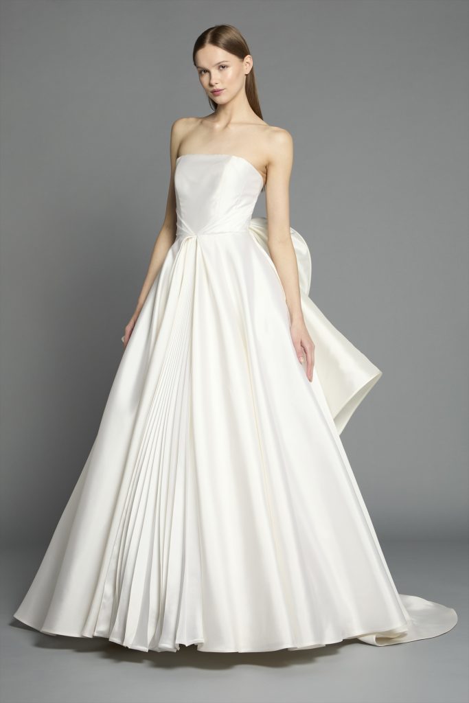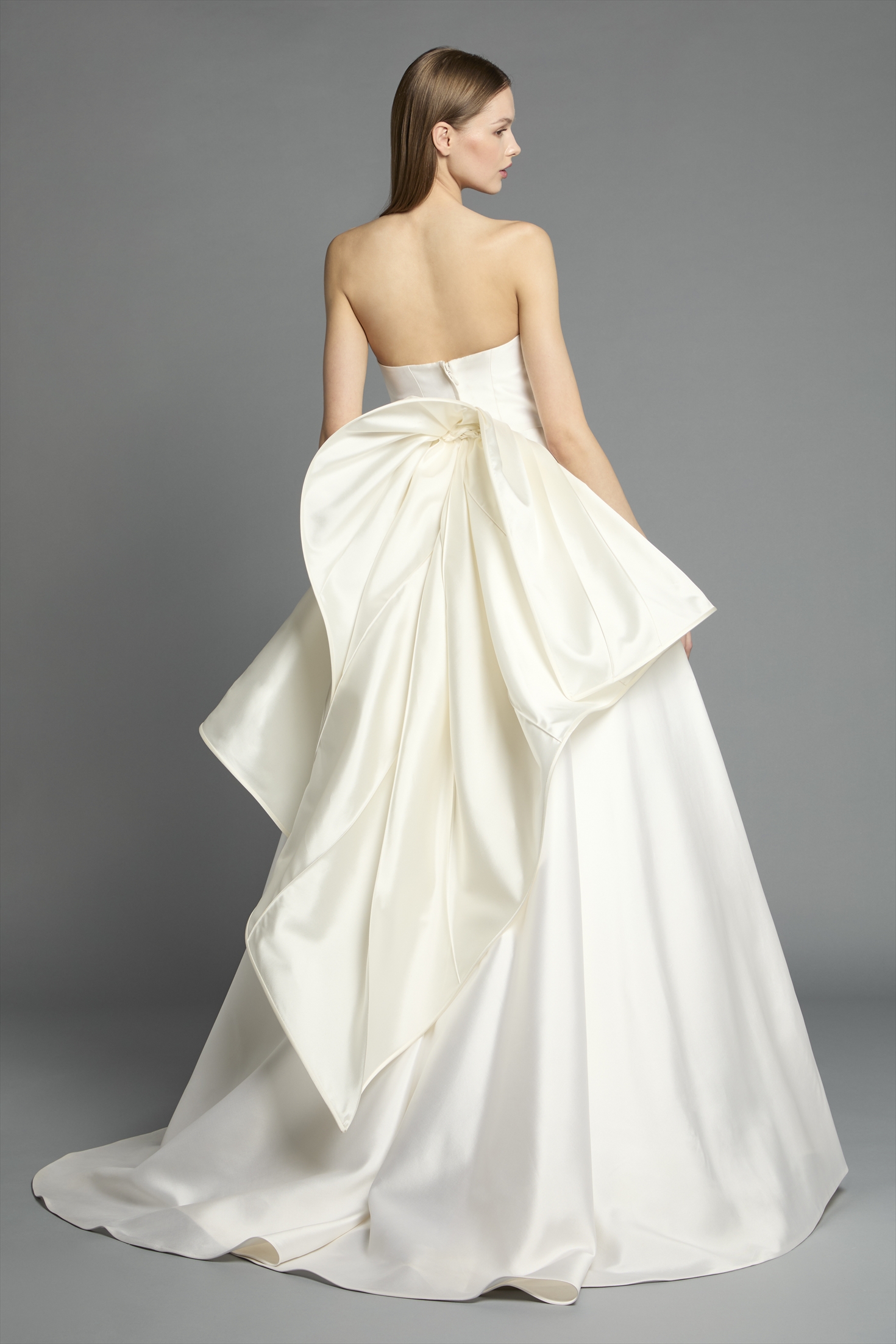 一歩ずつ歩みを進めるとスリットから美しいプリーツのパネルが覗きます。ブランドの象徴である構築的なバックモチーフが魅力的で、ミカドの高級感が花嫁様を包み、幸福感と気品が満ち溢れる一着。