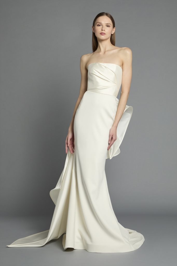 軽やかでイレギュラーなドレープが美しいミカド素材のビスチェ。ハリのある細いラインが動きとアシンメトリーなループを演出しています。バックスタイルには唯一無二の構築的なデザインが施され、サイドからのシルエットも美しく幻想的なお姿に。