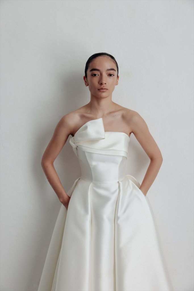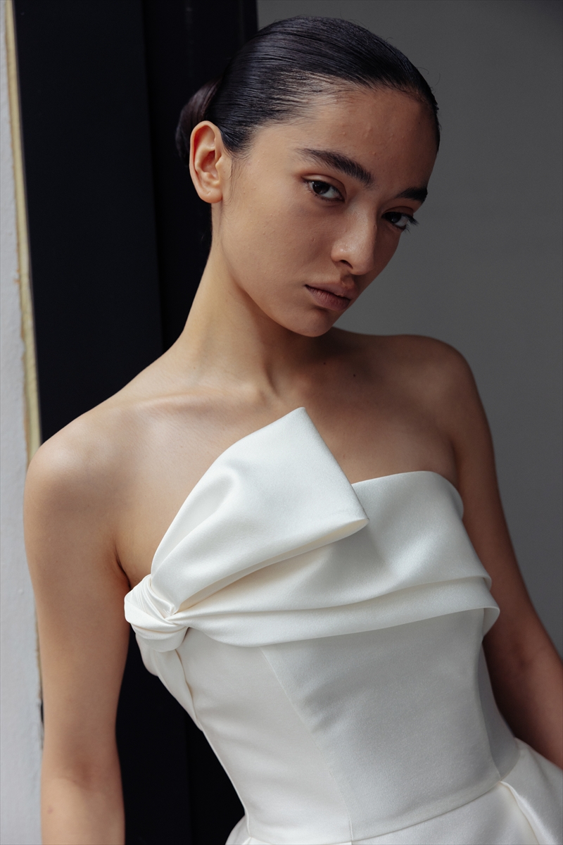 アシンメトリーのリボンディテールが特徴で、さりげない遊び心とクラシックなフォルムが調和した一着。ボリュームのあるAラインスカートは優雅に揺れ動き、柔らかな魅力とタイムレスな美しさを演出します。