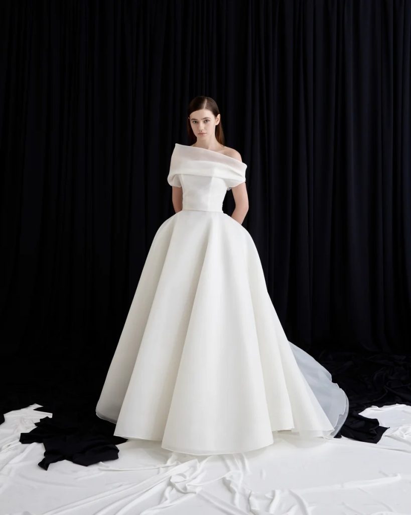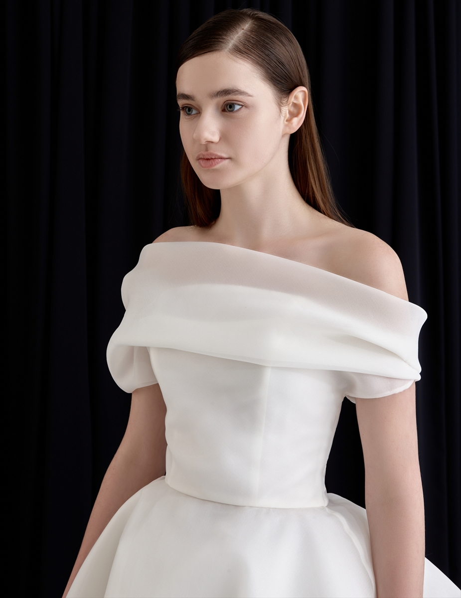 優しく包み込む贅沢なアシンメトリーネックラインが魅力的で、控えめなエレガンスを演出しています。シャープで直線的なフォルムと生地の繊細な流れのコントラストが、華麗でありながら洗練された印象に。