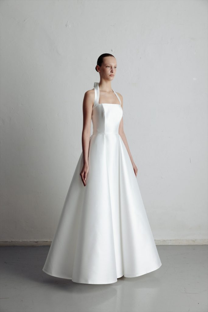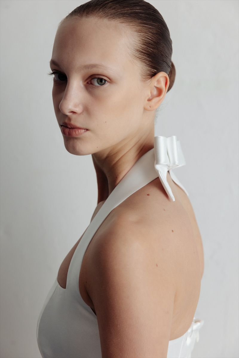 首元をすっきりと上品に見せるスクエアネックラインとフェミニンなリボンホルターネック。フェイス周りに華やかさと落ち着きをもたらします。胸元から裾まで続く縦ラインは、洗練さを醸し出し、細部に至るまでさりげないエレガンスが織り込まれています。