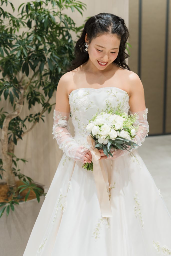 披露宴で着用したのは、草木や花の刺繡が印象的なドレス。